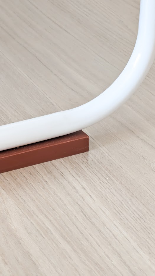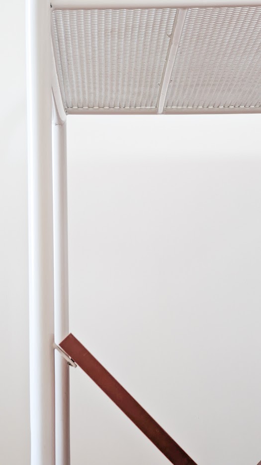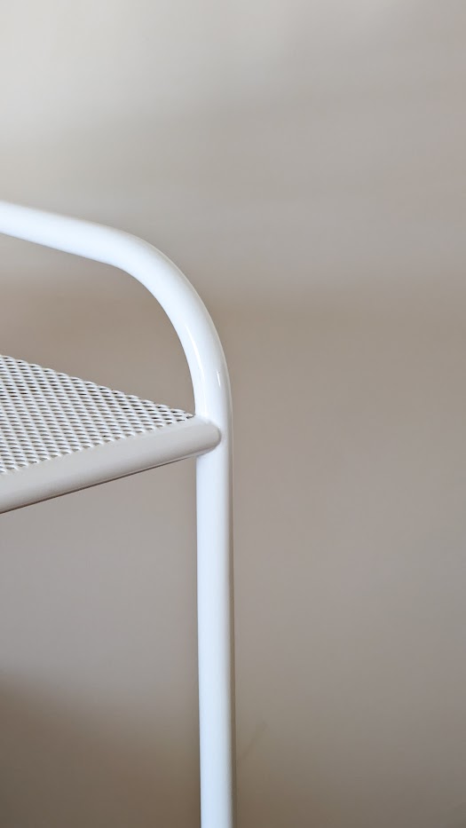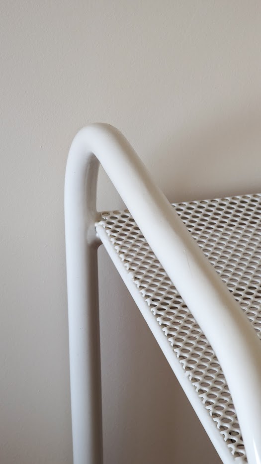 Com seu desenho e estrutura metálica branca, se deixa um desenho leve no ambiente, sendo seu tampo em chapa metálica perfurada, trazendo textura e dando contraste e destaque a vitrola e objetos da escolha de cada um para armonizar o tampo superior.