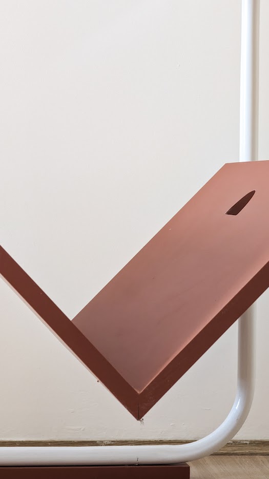 Abaixo, desenhamos em “V” uma praleiera para apoiar os discos, podendo eles serem acomodados tanto com sua capa para frente, como com suas capas viradas para as laterais. As cores vermelhas ou amadeiradas fazem com que as capas se misturem e se tornem pertencente ao mobiliário.