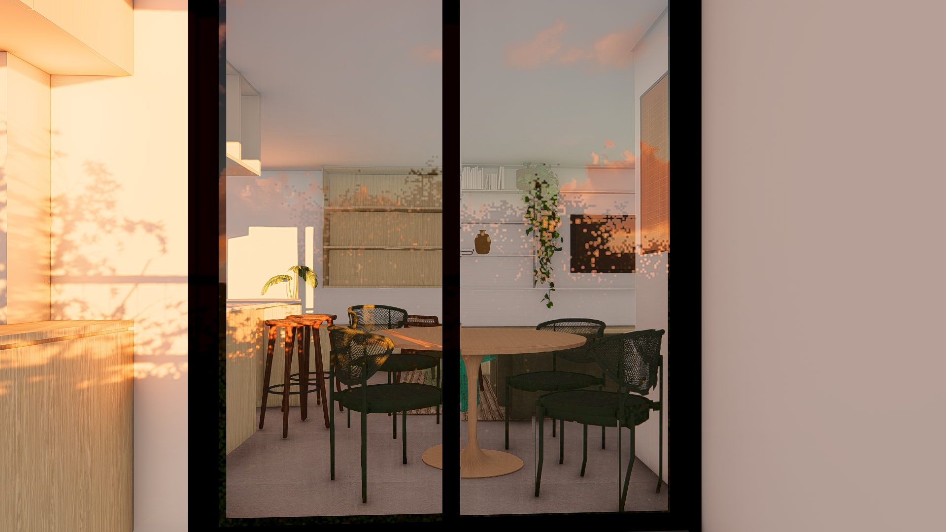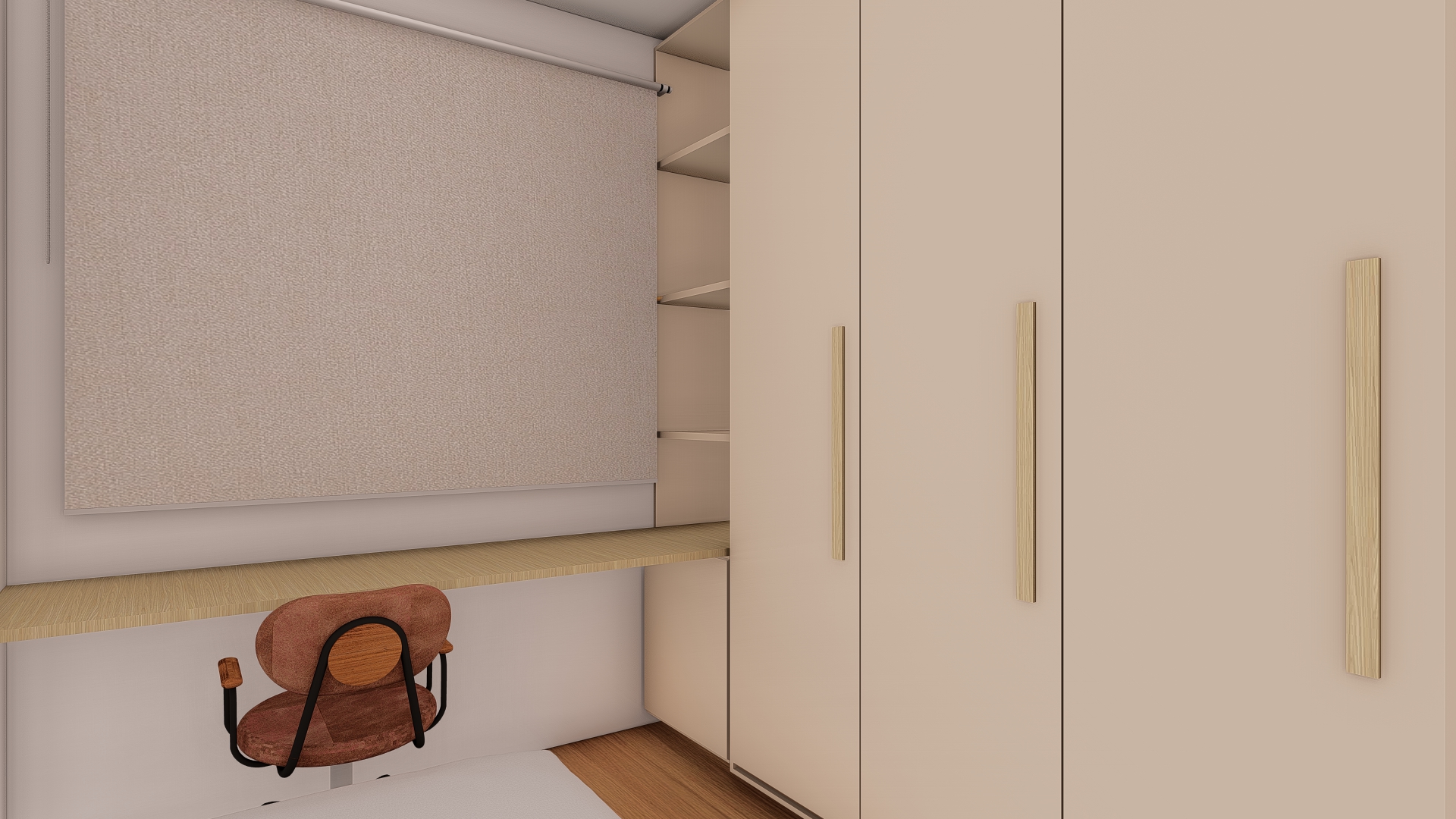 A escolha por madeiras claras contribui para adicionar textura e aconchego, enquanto a paleta de cores claras e o uso de vidros jateados amplia a sensação de leveza e luminosidade, criando uma base neutra e elegante em toda a área social.