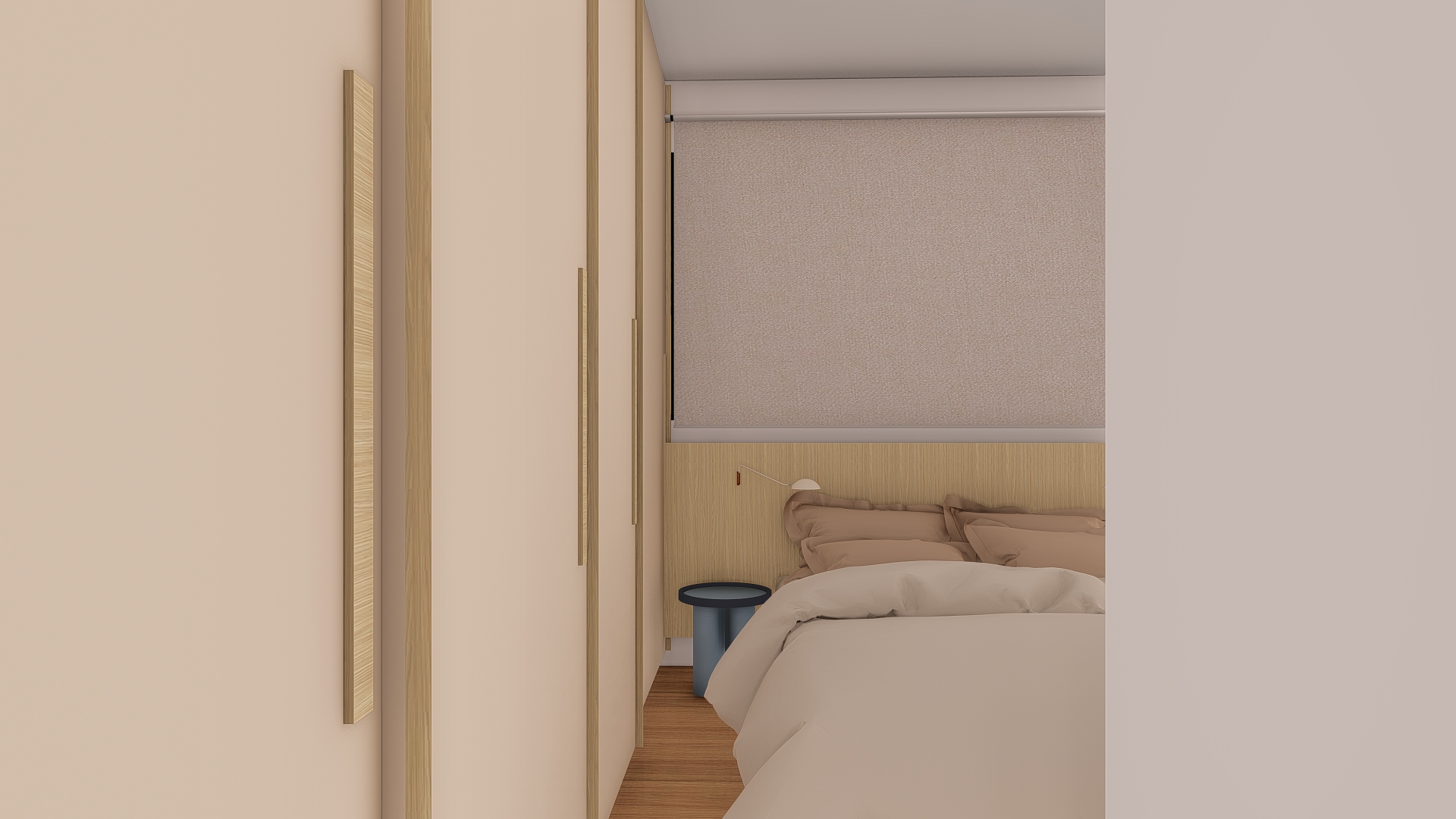 Nos dormitórios, o foco foi o conforto: armários planejados e cabeceiras com iluminação integrada criam uma atmosfera acolhedora e íntima.