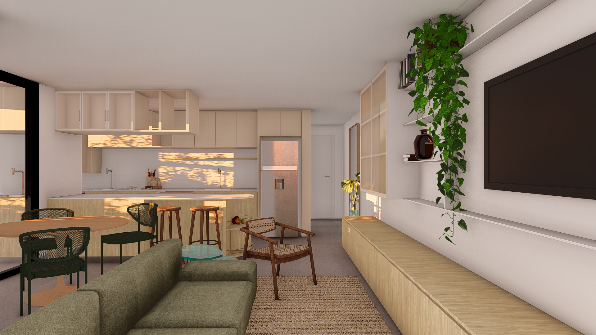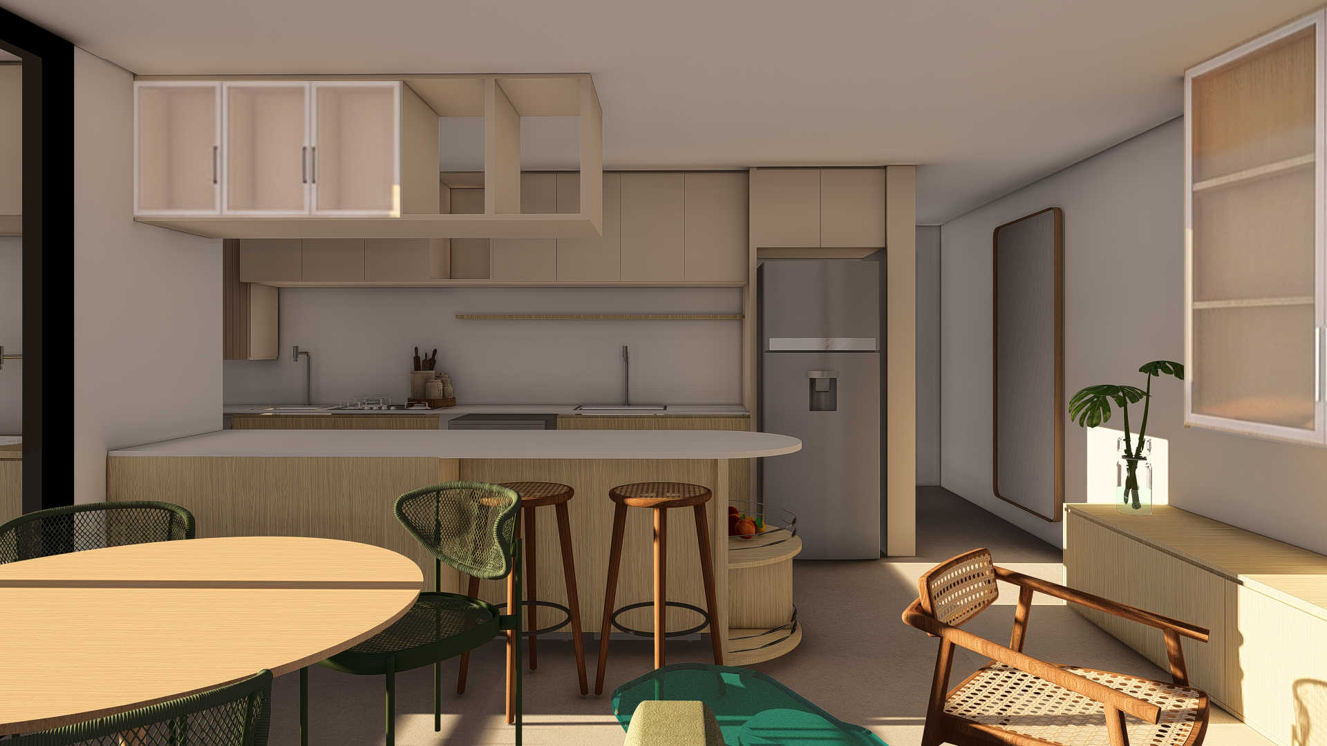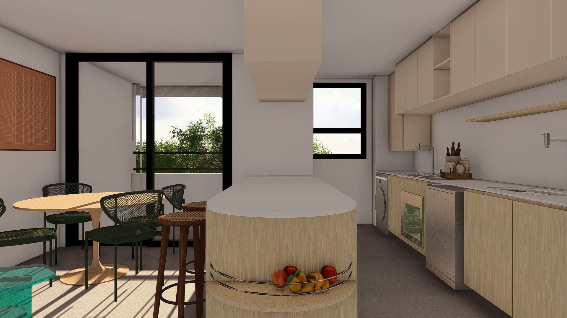 A cozinha, por sua vez, se conecta harmoniosamente ao restante do apartamento, tendo como elemento de transição uma ilha com banquetas, que reforça o caráter social e funcional do espaço.