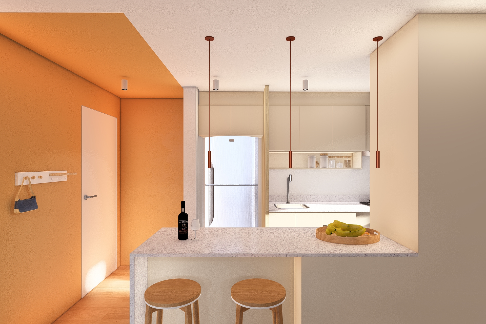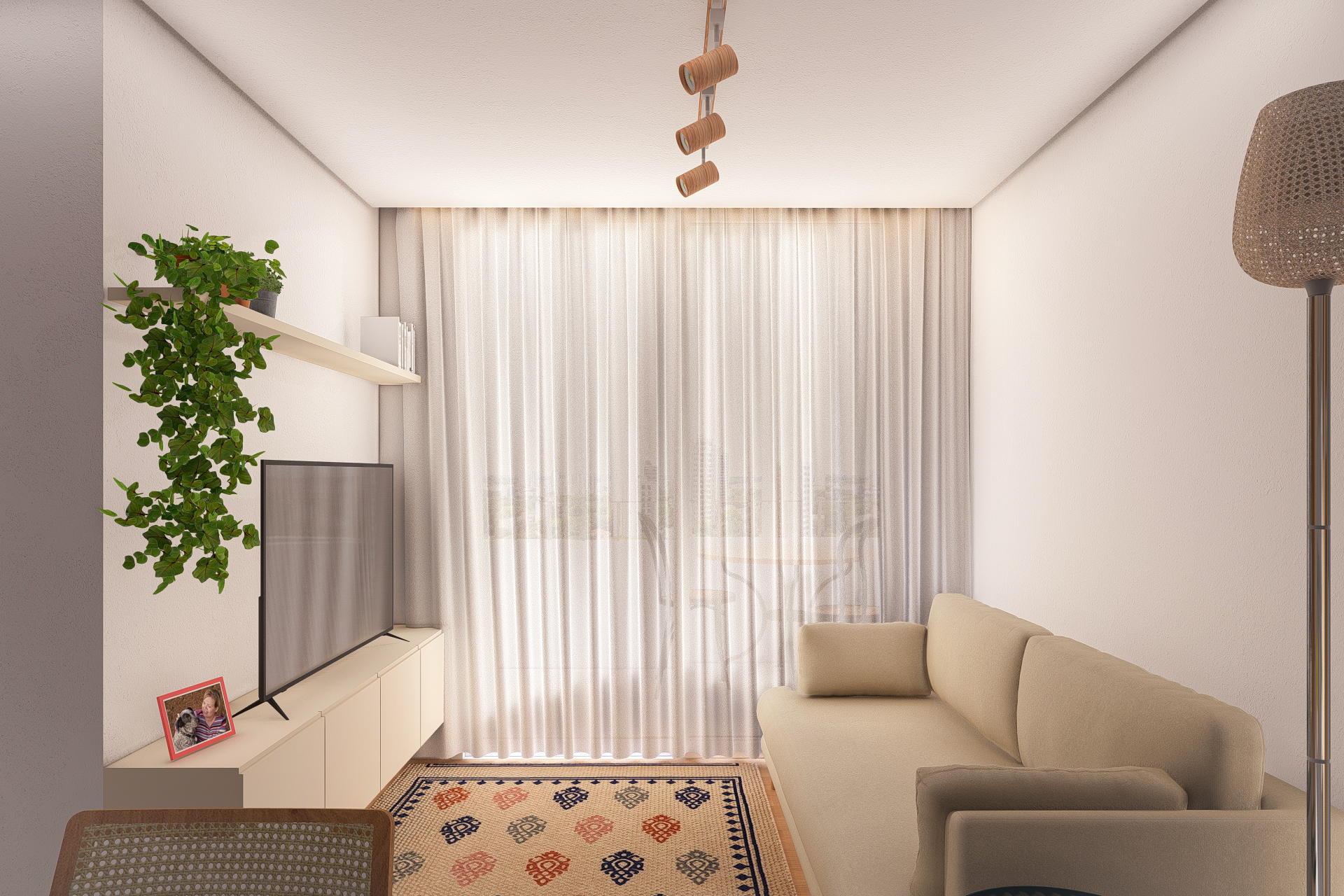 O apartamento entregue pela construtora com três quartos, sendo uma suíte, um banheiro social e sala integrada com cozinha e lavanderia. Todos os revestimentos seriam mantidos com exceção da marmoraria. A cliente queria uma linguagem leve e aconchegante para sua nova casa.