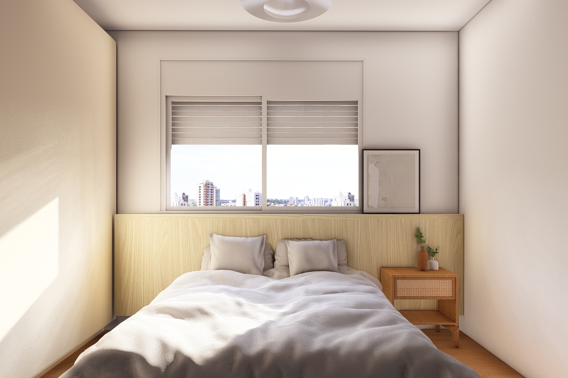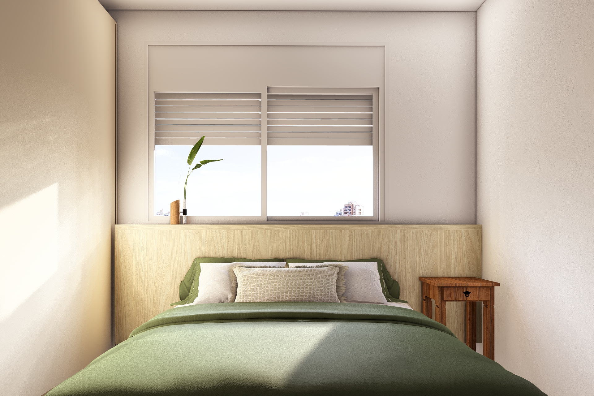 Nos quartos, cabeceiras em madeira, e guarda-roupas brancos com puxadores em madeira, criando um ambiente perfeito para o descanso. E dessa forma se completa o Apartamento Régia, abrindo também lugar para destaques de decorações e mobiliários afetivos da cliente.