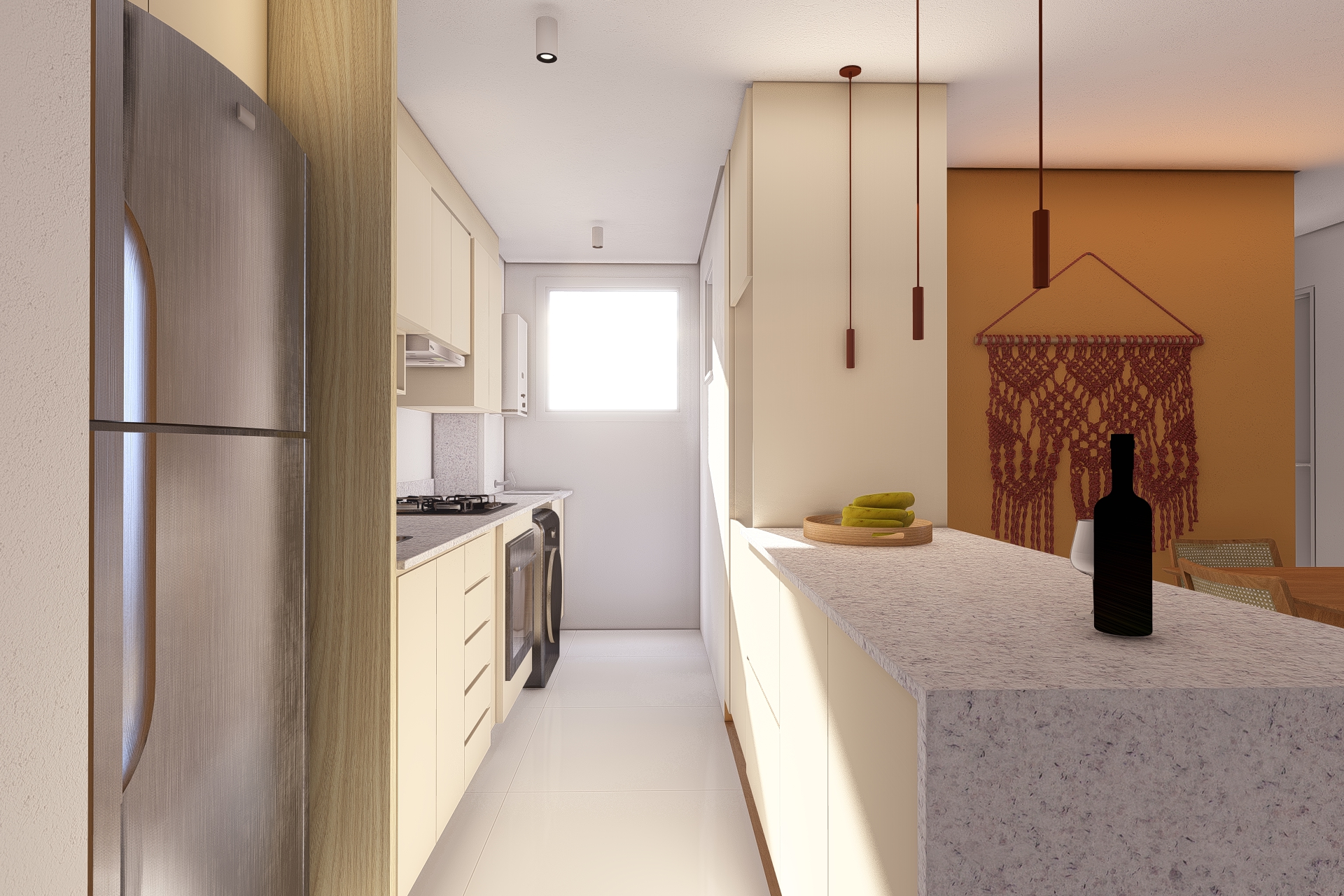 Na cozinha, muitos espaços de armazenamento foram criados, e a marmoraria em quartzo integrando cozinha e lavanderia, em uma única bancada, dividindo as funções através da marmoraria.