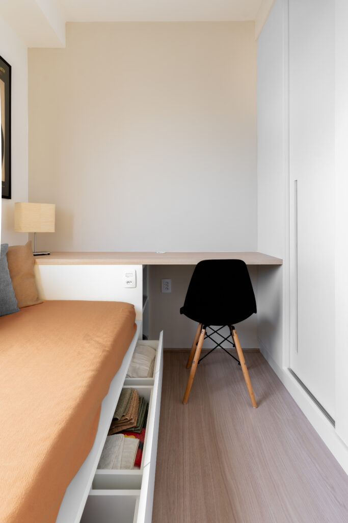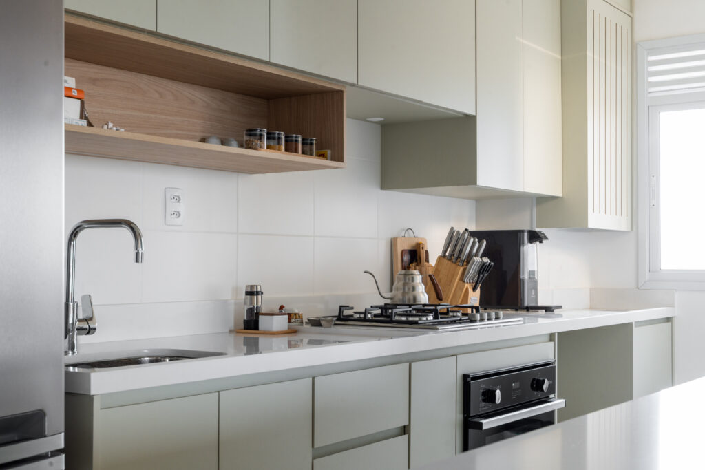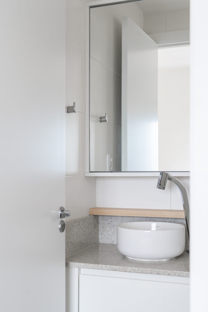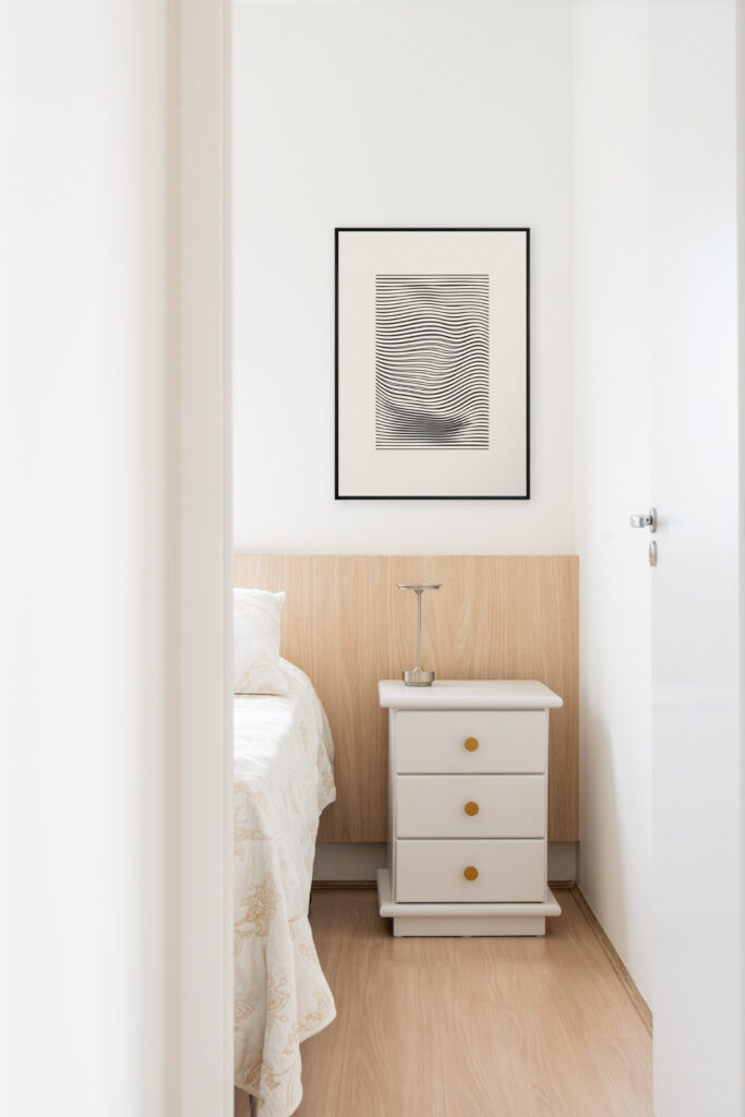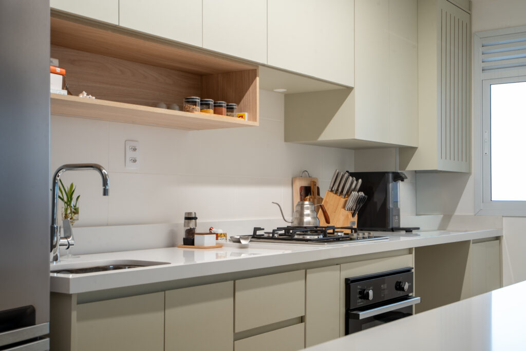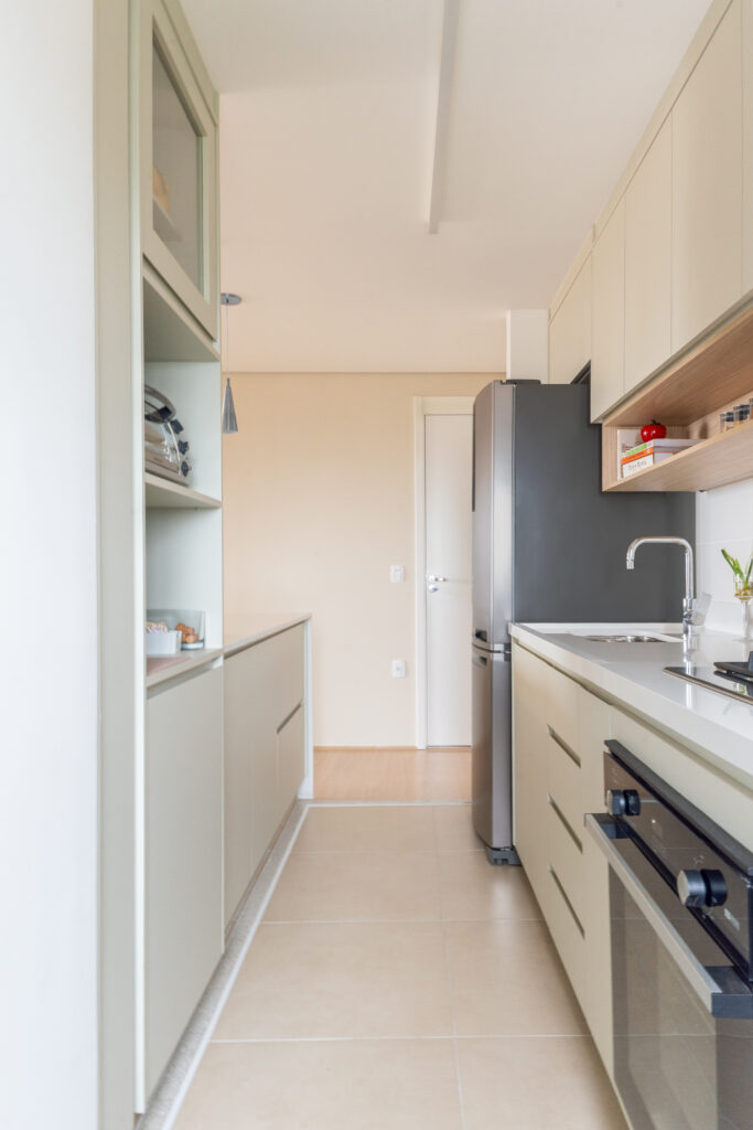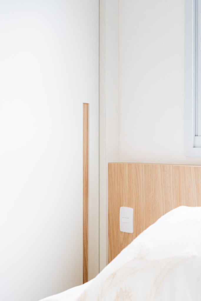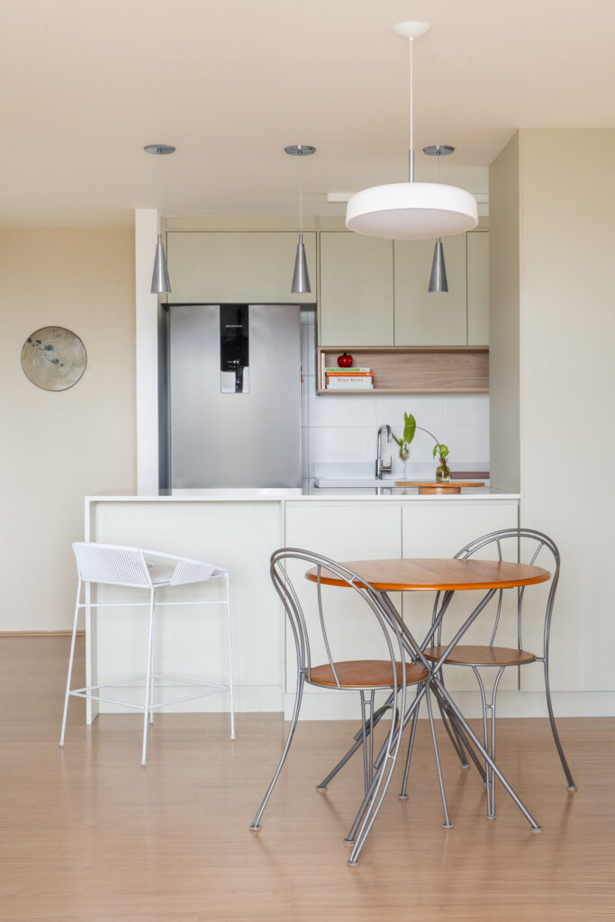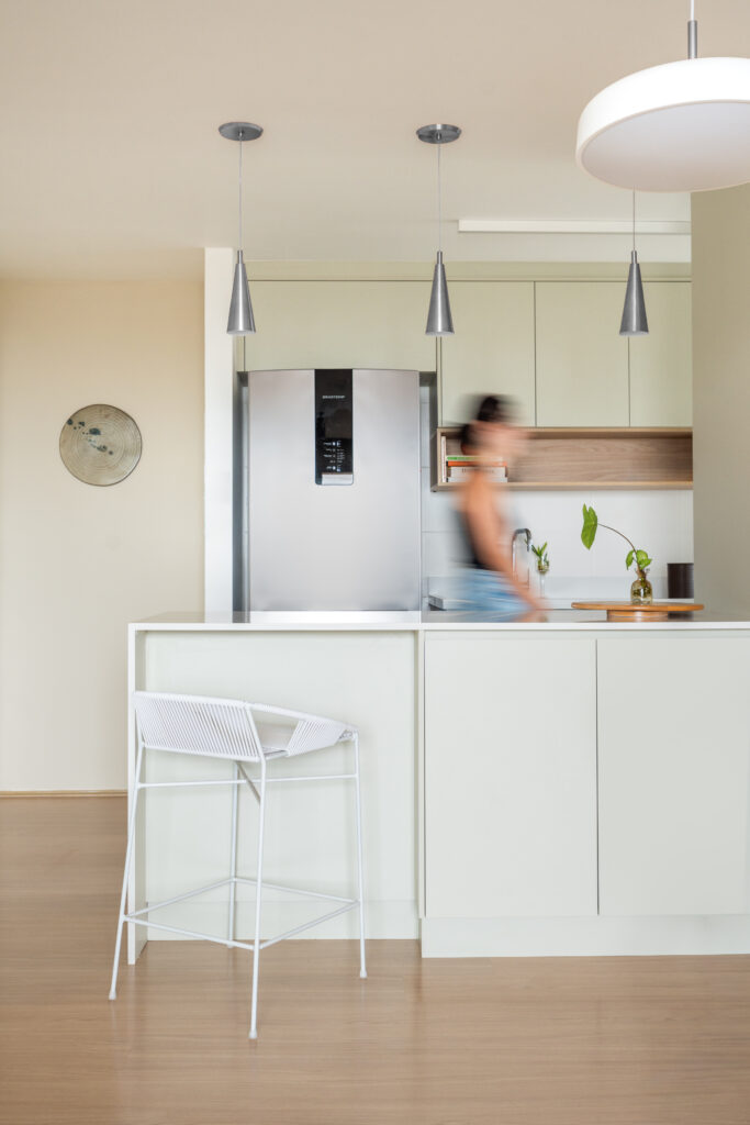 O apartamento entregue pela construtora com três quartos, sendo uma suíte, um banheiro social e sala integrada com cozinha e lavanderia. Todos os revestimentos e cômodos seriam mantidos, com exceção da marmoraria, que, na cozinha trocamos por um quartzo branco que era o sonho da cliente, e nos banheiros também em uma linguagem mais clara, a pedra branco itaúnas. A cliente queria uma linguagem leve e aconchegante para sua nova casa, sem fugir muito do que se entende por tradicional. Criamos uma paleta de cores e sem esquecer das texturas para trazer esse conforto ao lar. Entre tons amadeirados, beges e verde claro, nasce esse espaço. Na cozinha, muitos espaços de armazenamento foram criados, e a marmoraria em quartzo integrando cozinha e lavanderia, em uma única bancada, dividindo as funções através da marmoraria. Entre cozinha e salas, uma península também em quartzo, trazendo essa integração leve ao ambiente. Na parte posterior a ela, lugares para acomodar banquetas, e variar o uso da península, e também um armário, servindo de apoio à sala de jantar. Na sala, racks e prateleiras compõem o espaço. Nos quartos, cabeceiras em madeira, e guarda-roupas brancos com puxadores em madeira, criando um ambiente perfeito para o descanso. E dessa forma se completa o Apartamento Régia, abrindo também lugar e liberdade para destaques de decorações e mobiliários afetivos da cliente, conforme seu gosto.
