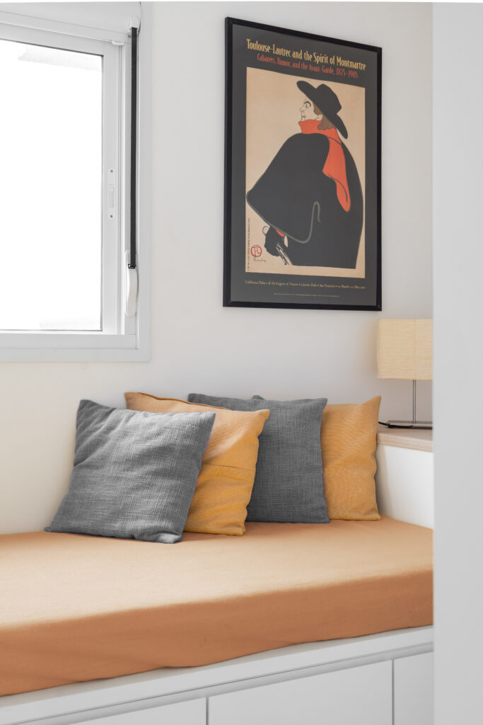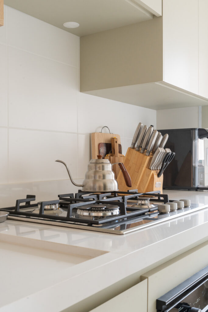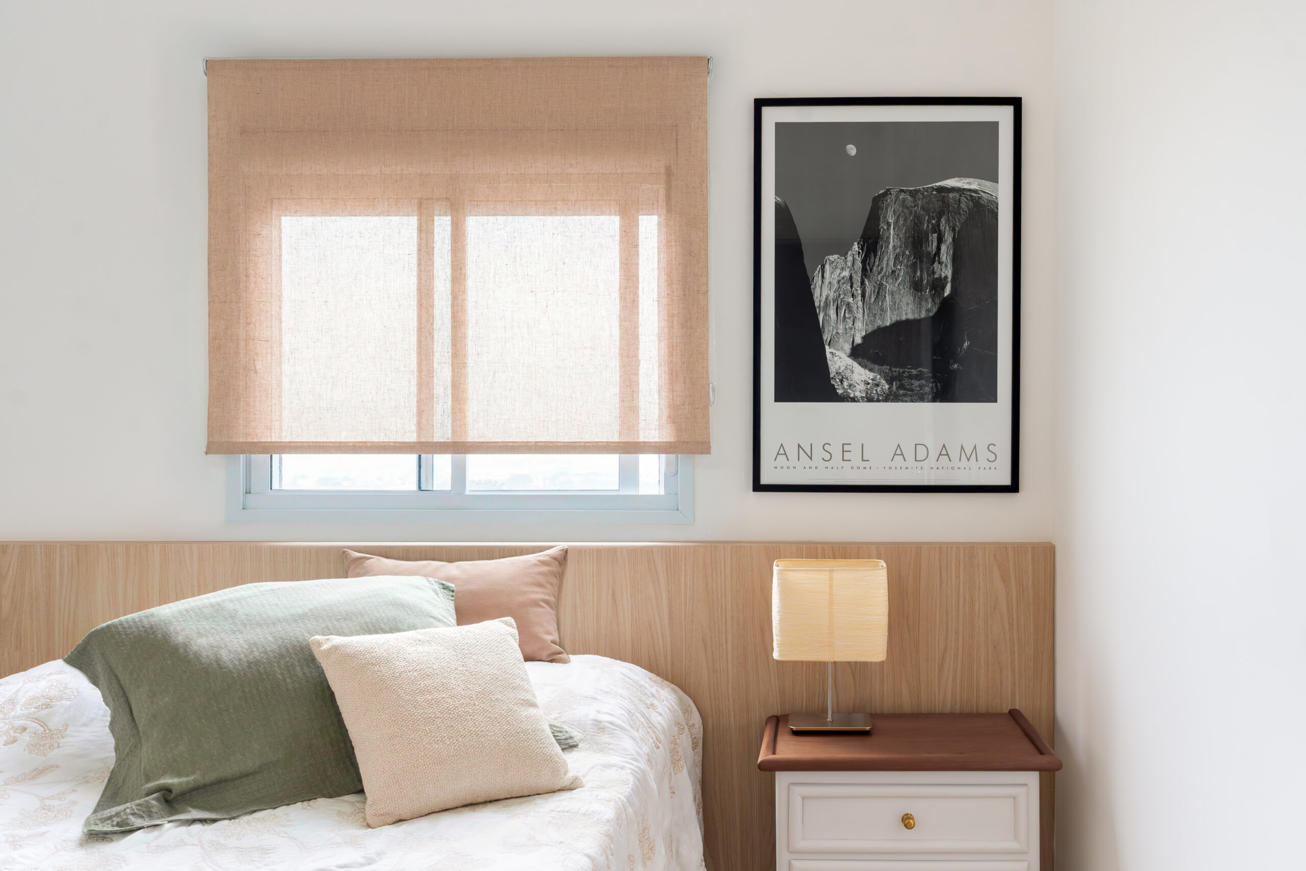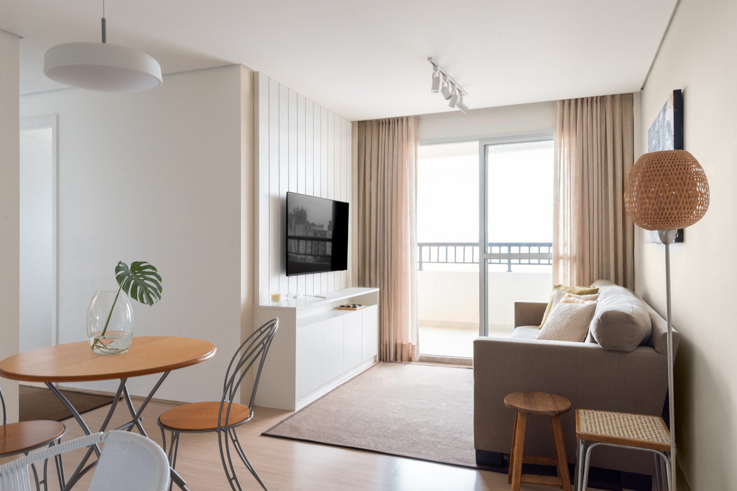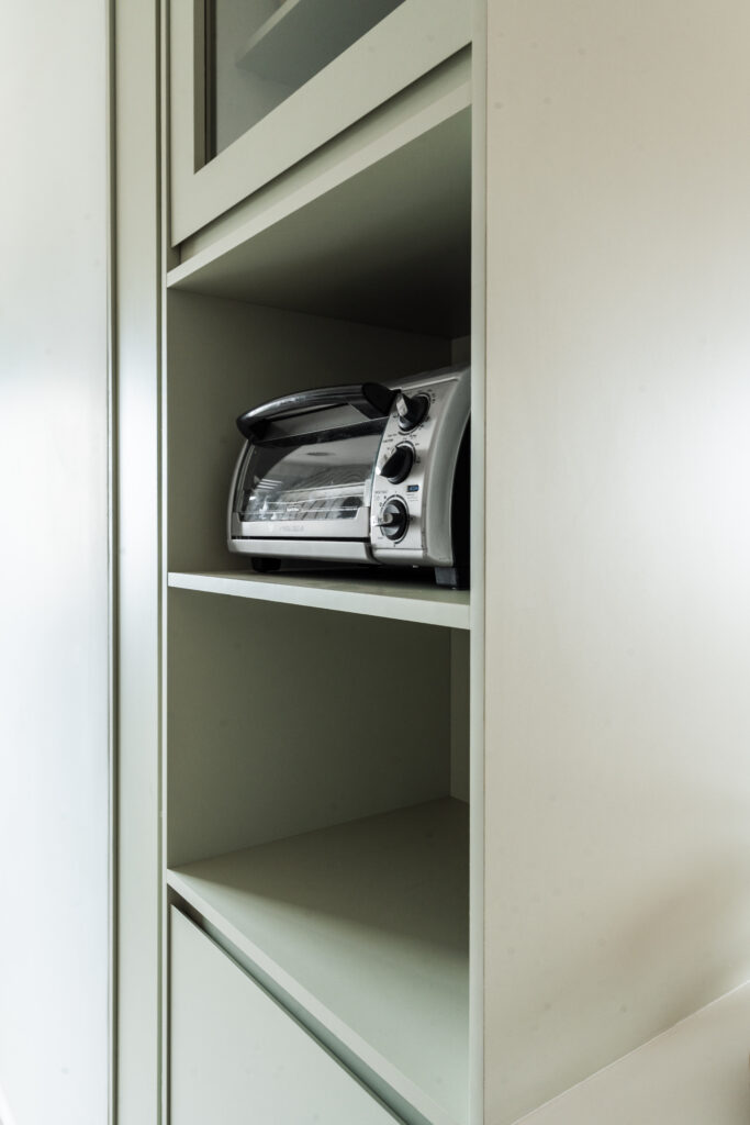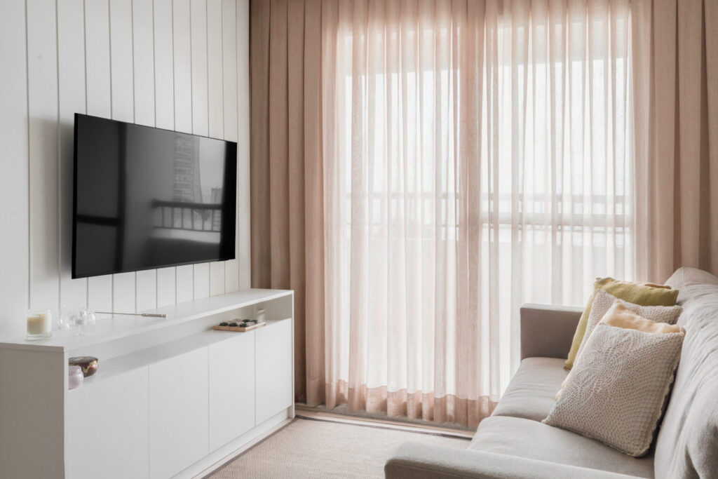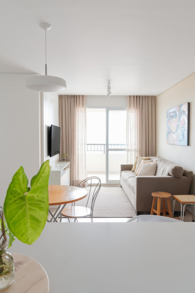 O apartamento entregue pela construtora com três quartos, sendo uma suíte, um banheiro social e sala integrada com cozinha e lavanderia. Todos os revestimentos e cômodos seriam mantidos, com exceção da marmoraria, que, na cozinha trocamos por um quartzo branco que era o sonho da cliente, e nos banheiros também em uma linguagem mais clara, a pedra branco itaúnas. A cliente queria uma linguagem leve e aconchegante para sua nova casa, sem fugir muito do que se entende por tradicional. Criamos uma paleta de cores e sem esquecer das texturas para trazer esse conforto ao lar. Entre tons amadeirados, beges e verde claro, nasce esse espaço. Na cozinha, muitos espaços de armazenamento foram criados, e a marmoraria em quartzo integrando cozinha e lavanderia, em uma única bancada, dividindo as funções através da marmoraria. Entre cozinha e salas, uma península também em quartzo, trazendo essa integração leve ao ambiente. Na parte posterior a ela, lugares para acomodar banquetas, e variar o uso da península, e também um armário, servindo de apoio à sala de jantar. Na sala, racks e prateleiras compõem o espaço. Nos quartos, cabeceiras em madeira, e guarda-roupas brancos com puxadores em madeira, criando um ambiente perfeito para o descanso. E dessa forma se completa o Apartamento Régia, abrindo também lugar e liberdade para destaques de decorações e mobiliários afetivos da cliente, conforme seu gosto.