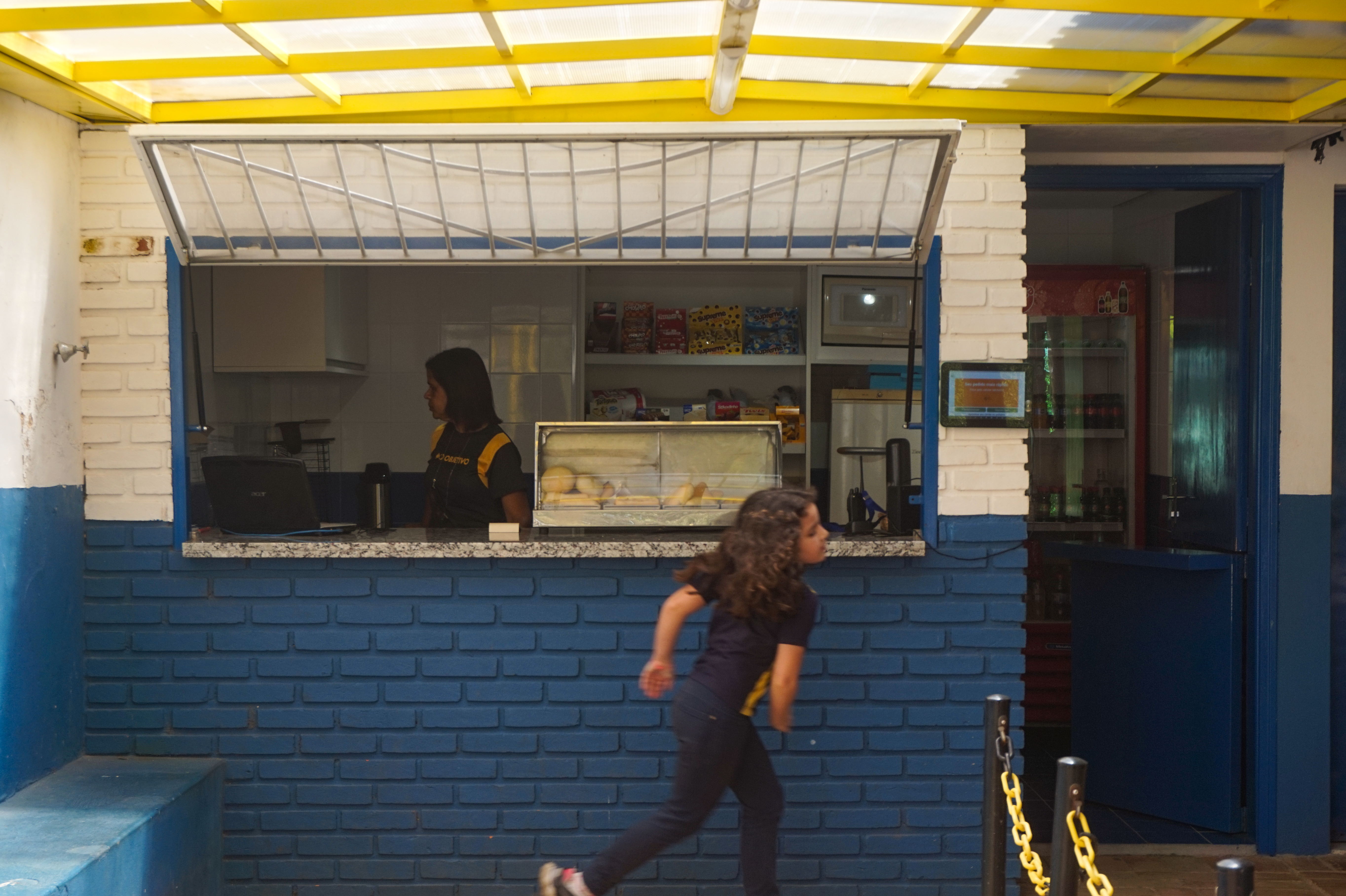 Um pronunciamento na fachada foi feito, sem precisar ampliar o telhado existente. O peitoril da janela já se torna uma bancada para servir os alimentos e também com uma banqueta, para trabalho. Sob a bancada, armários para armazenamentos. Na fachada, os tijolinhos a vista se mantiveram, para seguir uma linguagem local, e também trazer mais texturas para o visual e complementar a paisagem. Também externamente, seguindo a marca do colégio, meia parede em azul, e para cima branco, e assim seguimos inclusive na parte interna, porém contempladas através de pisos e azulejos 20x20cm.