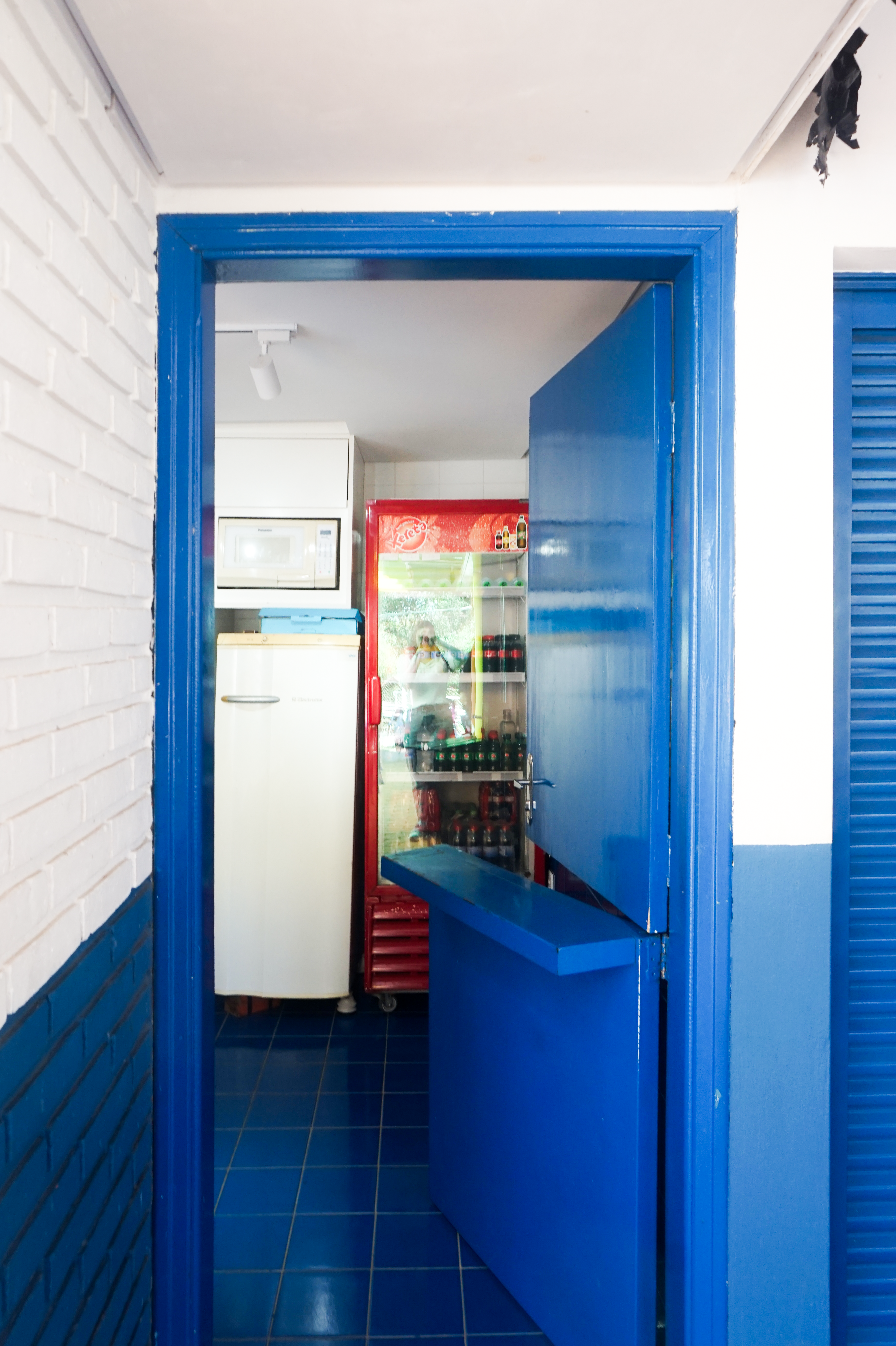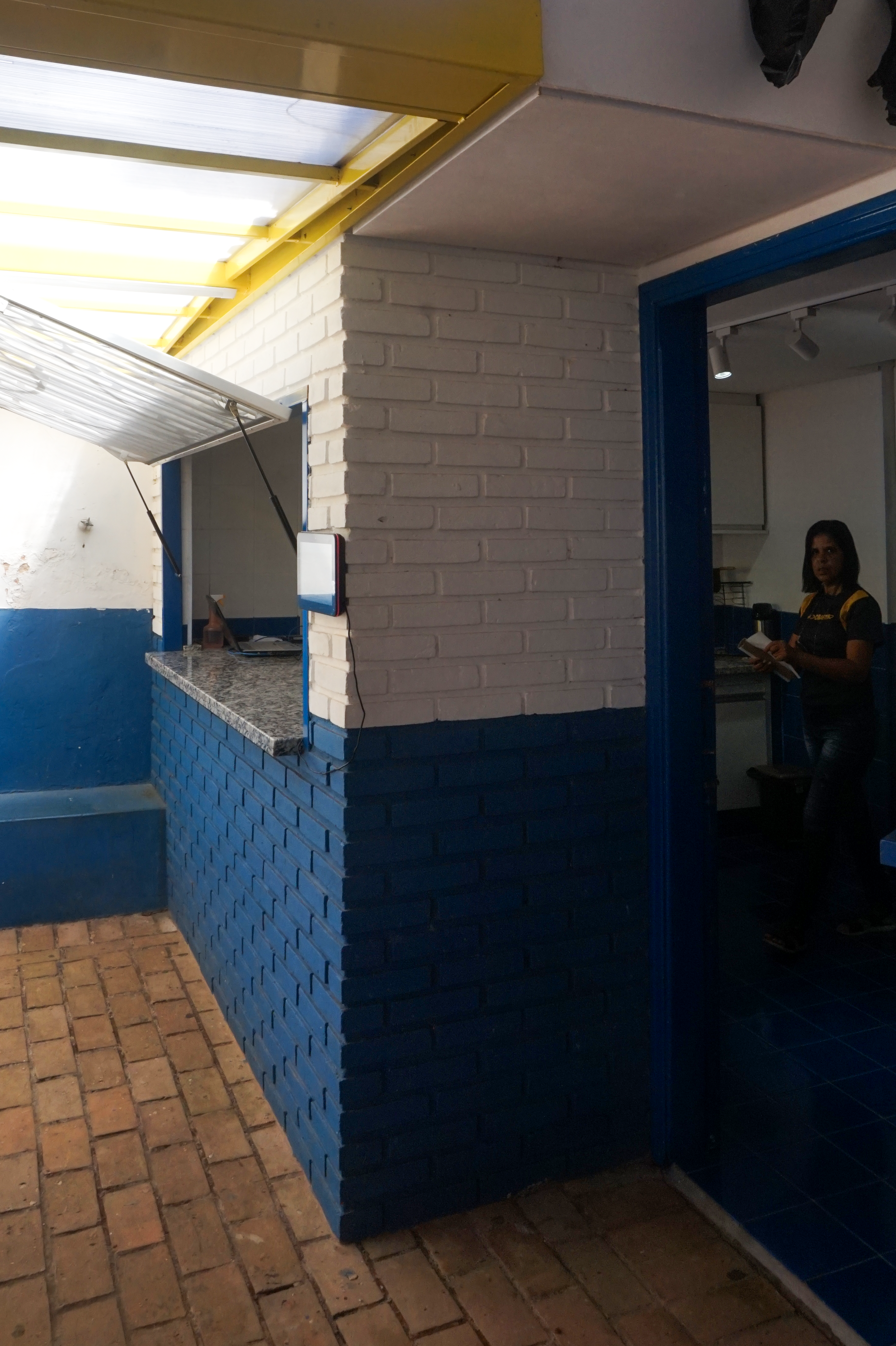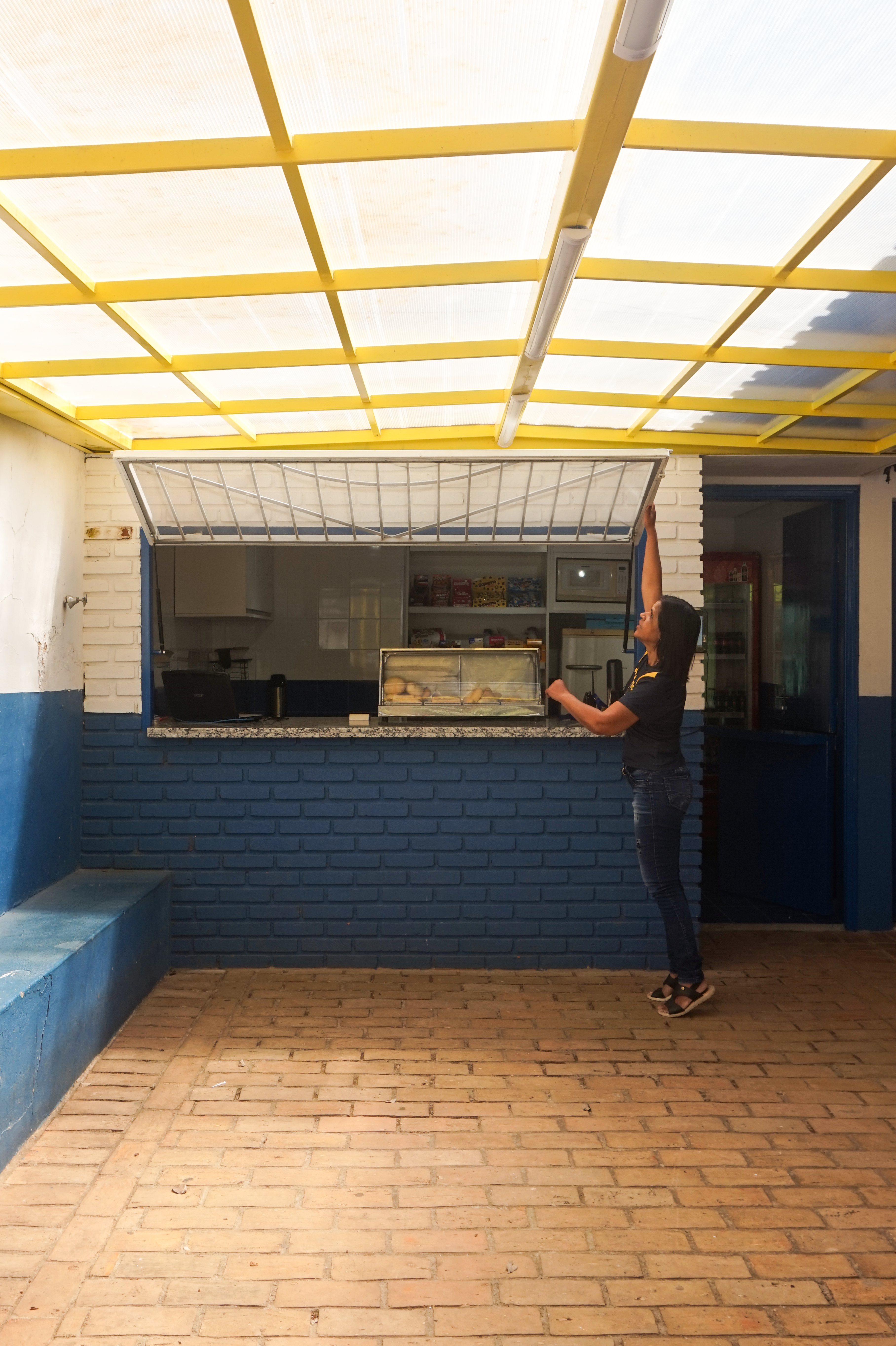Um pronunciamento na fachada foi feito, sem precisar ampliar o telhado existente. O peitoril da janela já se torna uma bancada para servir os alimentos e também com uma banqueta, para trabalho. Sob a bancada, armários para armazenamentos. Na fachada, os tijolinhos a vista se mantiveram, para seguir uma linguagem local, e também trazer mais texturas para o visual e complementar a paisagem. Também externamente, seguindo a marca do colégio, meia parede em azul, e para cima branco, e assim seguimos inclusive na parte interna, porém contempladas através de pisos e azulejos 20x20cm.