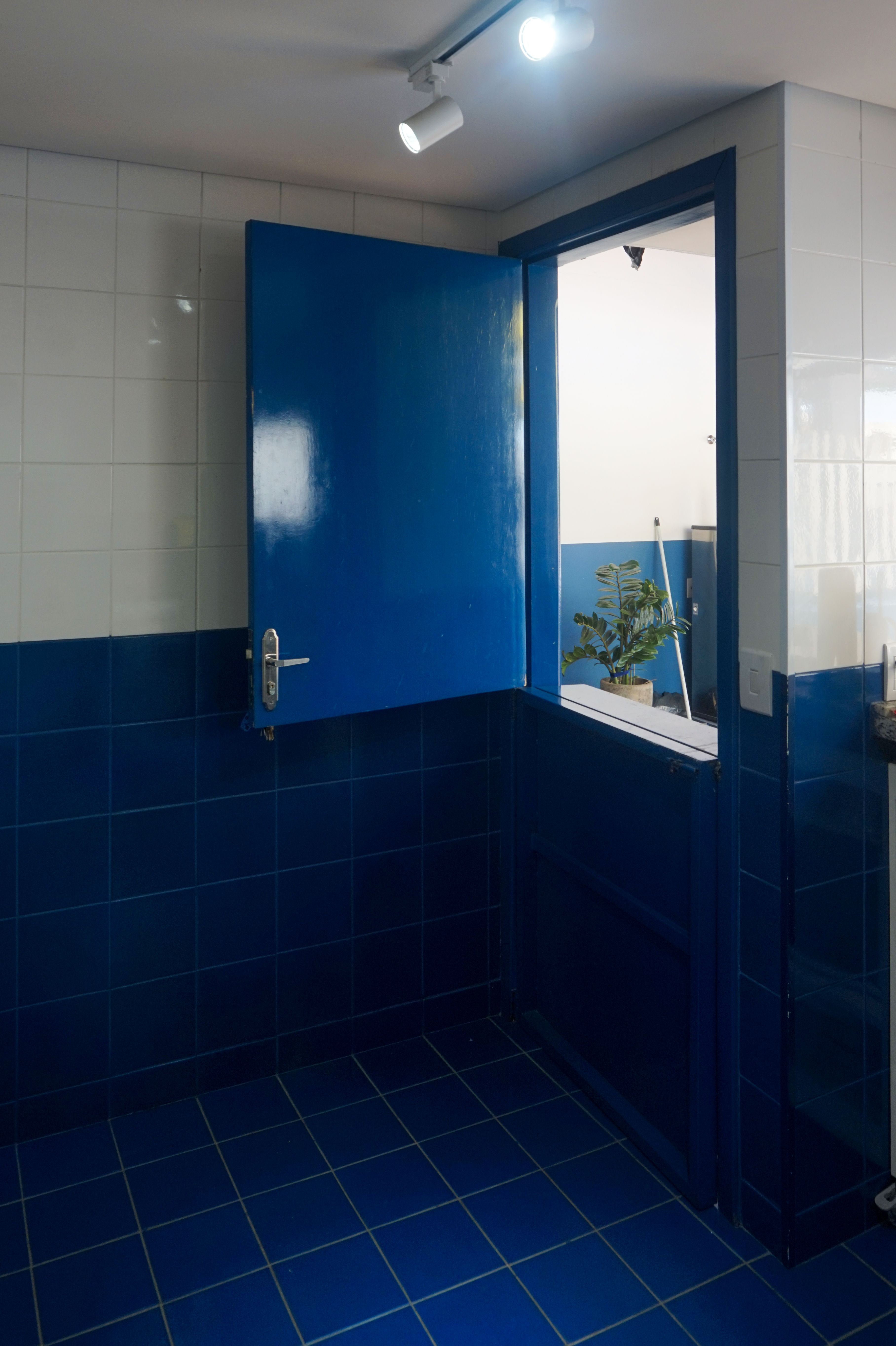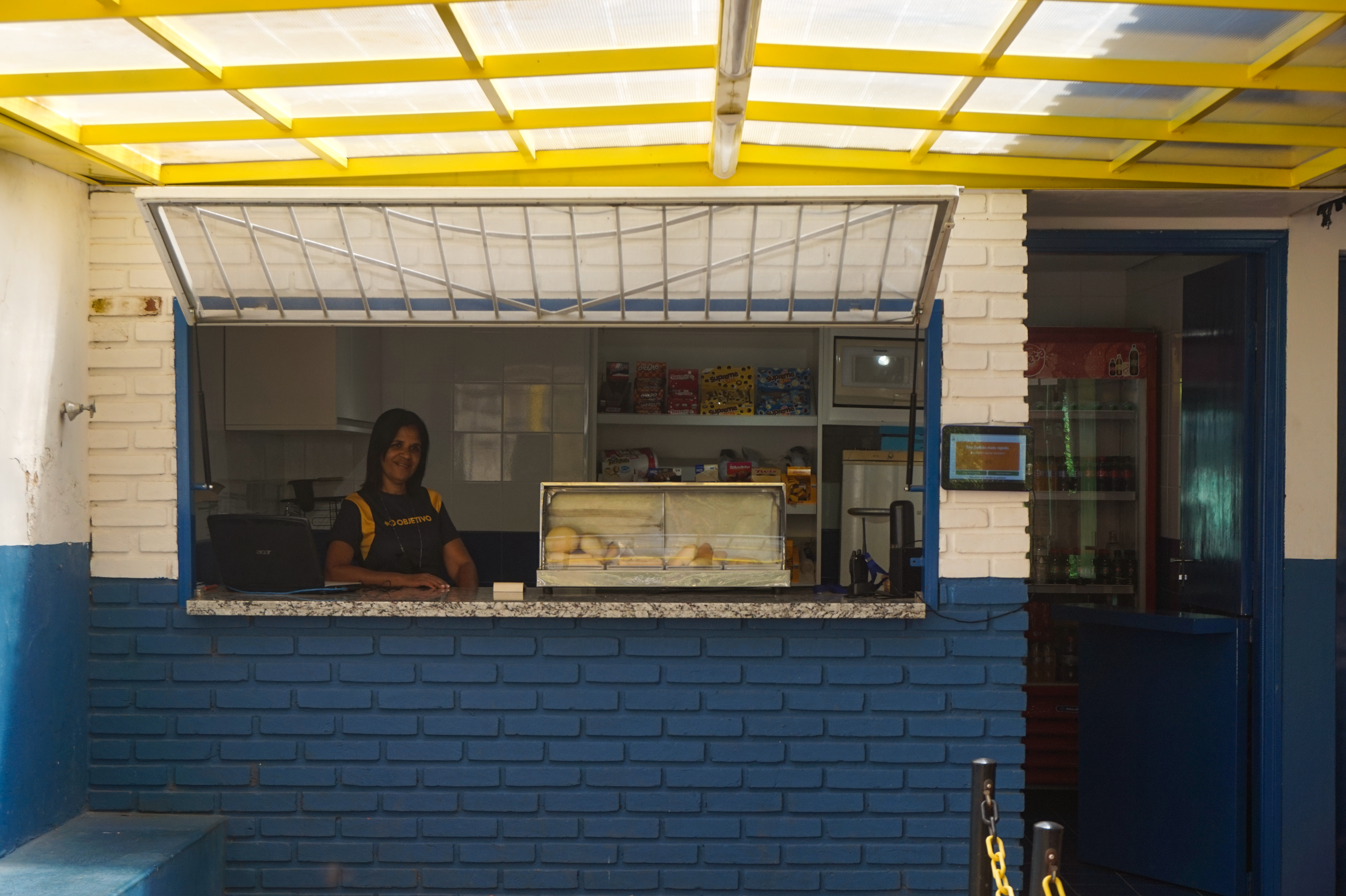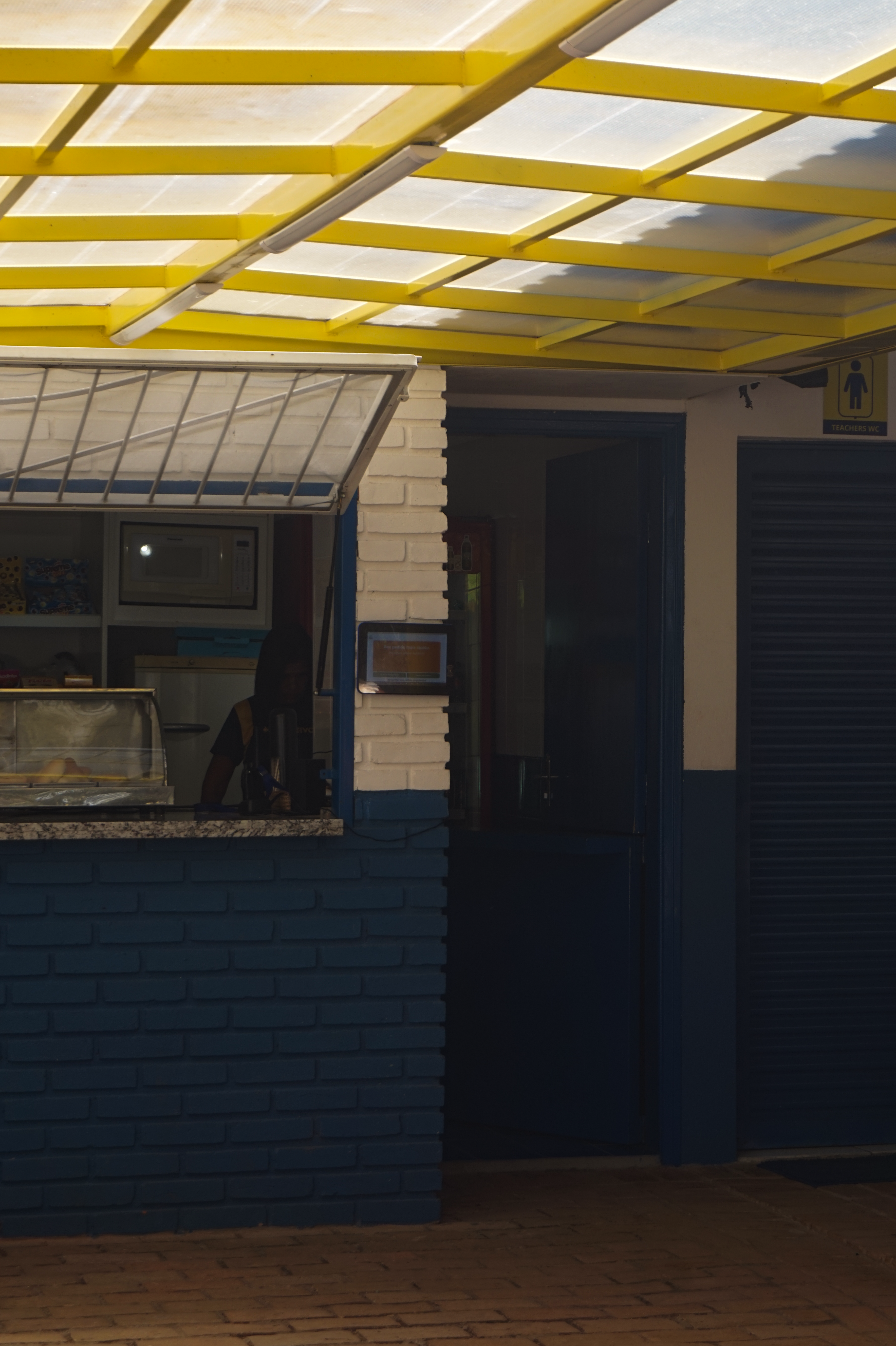 Um pronunciamento na fachada foi feito, sem precisar ampliar o telhado existente. O peitoril da janela já se torna uma bancada para servir os alimentos e também com uma banqueta, para trabalho. Sob a bancada, armários para armazenamentos. Na fachada, os tijolinhos a vista se mantiveram, para seguir uma linguagem local, e também trazer mais texturas para o visual e complementar a paisagem. Também externamente, seguindo a marca do colégio, meia parede em azul, e para cima branco, e assim seguimos inclusive na parte interna, porém contempladas através de pisos e azulejos 20x20cm.