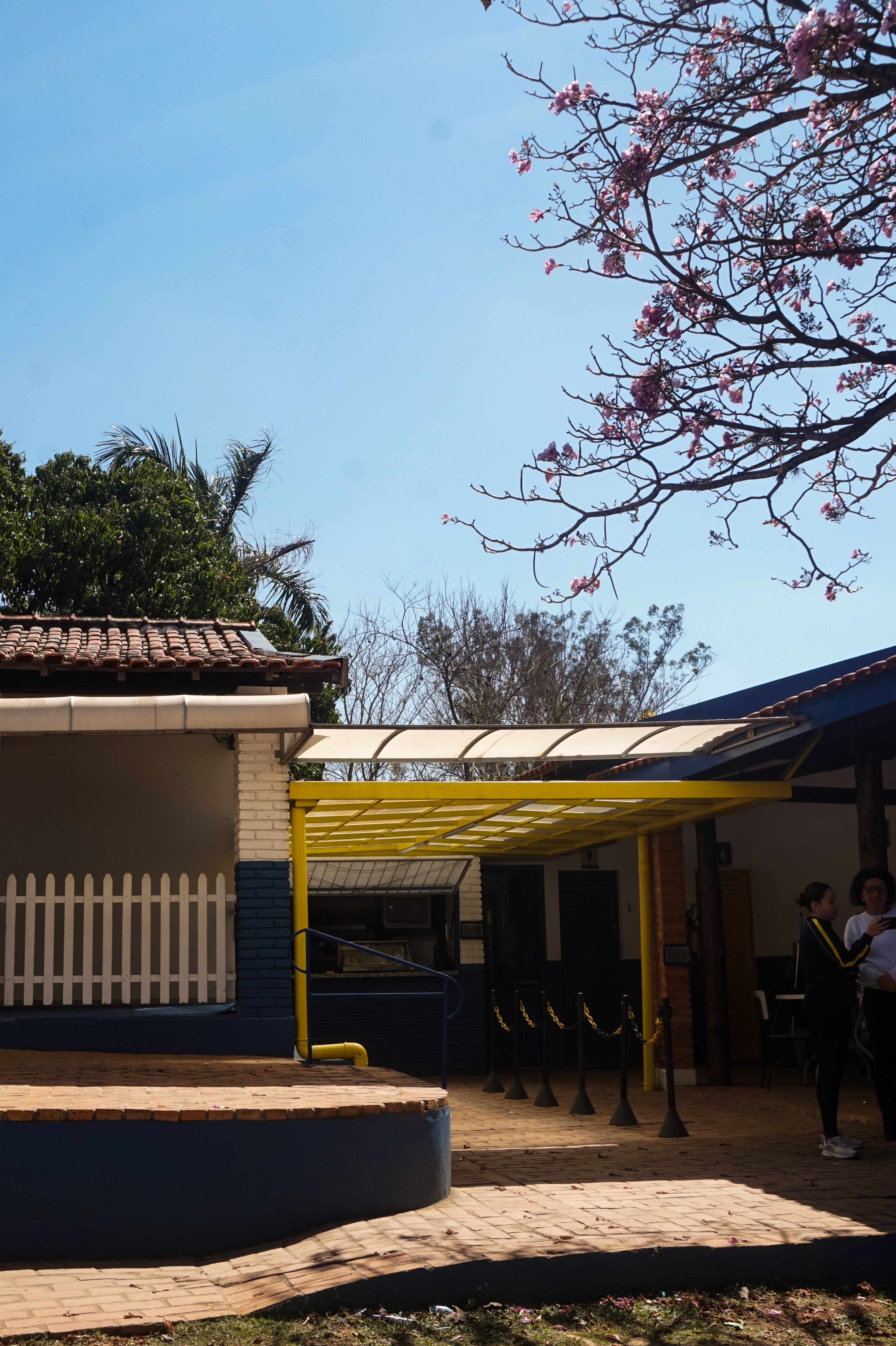 Na sua parte externa, uma cobertura em estrutura metálica amarela, complementando com mais uma cor da marca, e telhas em policarbonato, para manter a iluminação abaixo dela, e a partir dali, acontecem os encontros e se inicia o recreio!