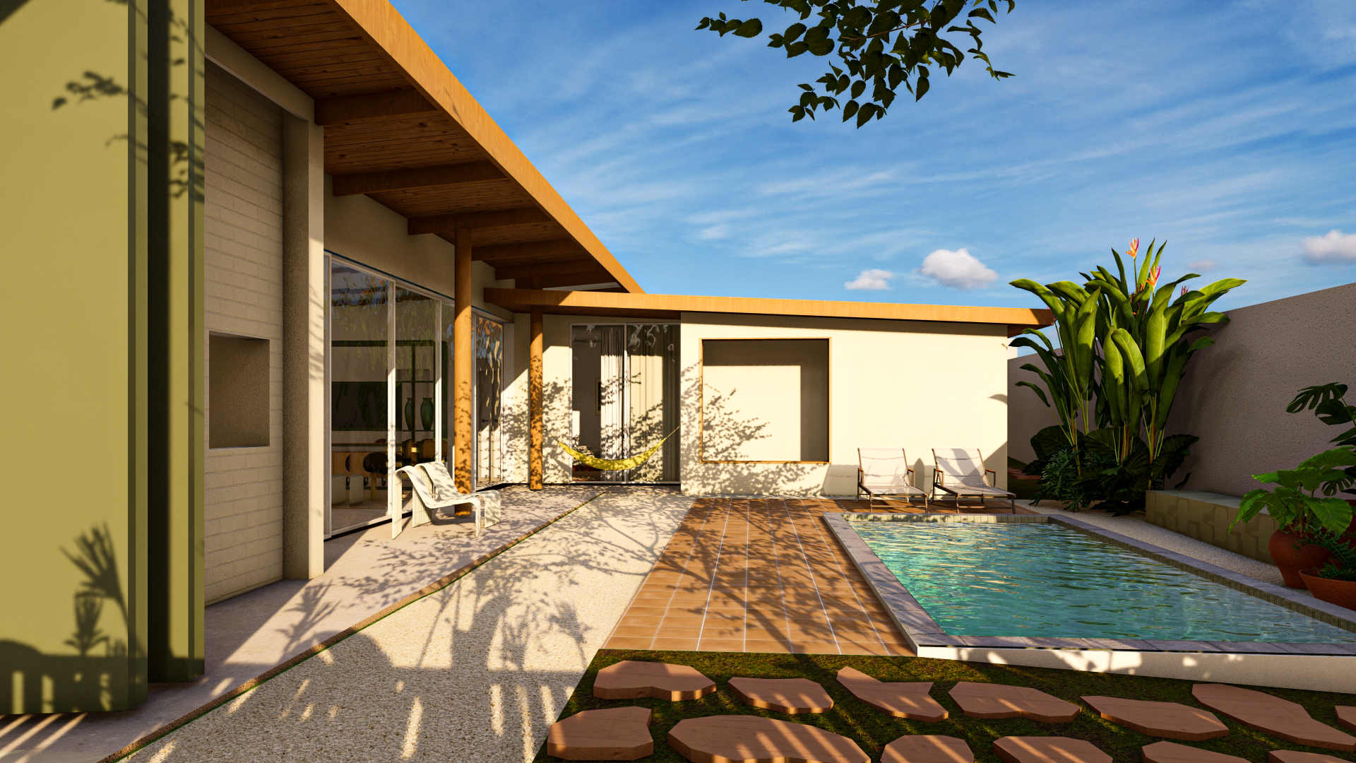 Essa proposta se concretiza a partir da implantação em “L”, em um terreno de 500 m², predominantemente plano. A casa ocupa o ponto mais alto do lote, ainda que com uma diferença sutil de nível. Sua disposição permeia os recuos e configura um pátio no canto esquerdo, cuidadosamente orientado para garantir boa insolação e ventilação.