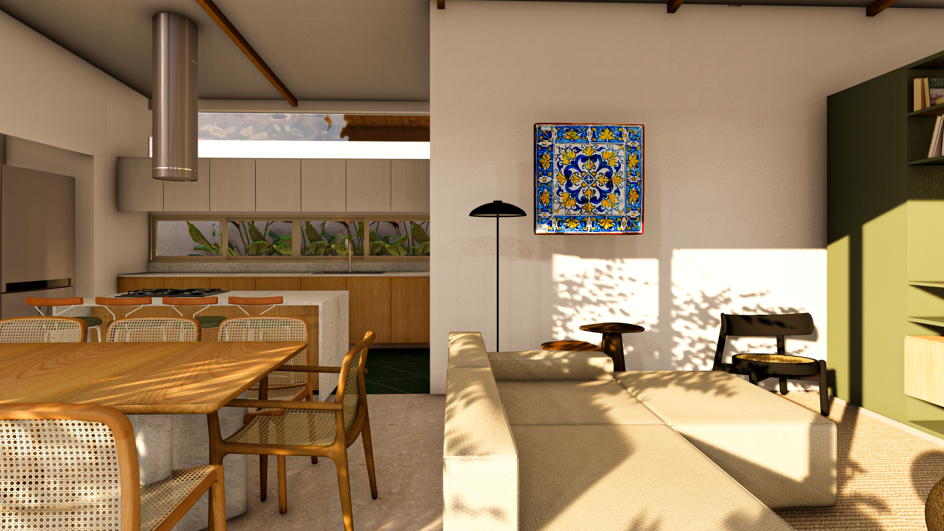 A casa se organiza em dois eixos: o eixo vertical abriga as áreas social e de serviço, enquanto o eixo horizontal concentra a área íntima dos dormitórios. Como essas fachadas recebem grandes aberturas e esquadrias, são envolvidas por varandas contínuas que contornam a construção. Essas varandas favorecem a ventilação cruzada — com aberturas em faces opostas — e, por meio de seus beirais, contribuem para o controle da incidência solar, mantendo o interior mais fresco mesmo nos dias mais quentes.