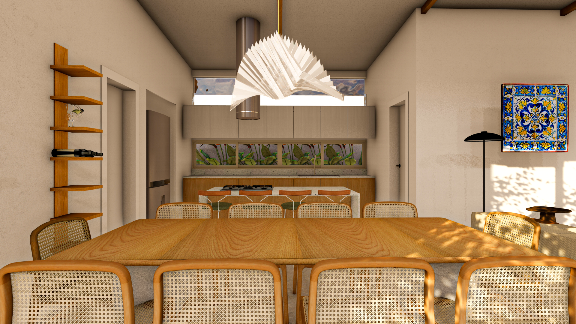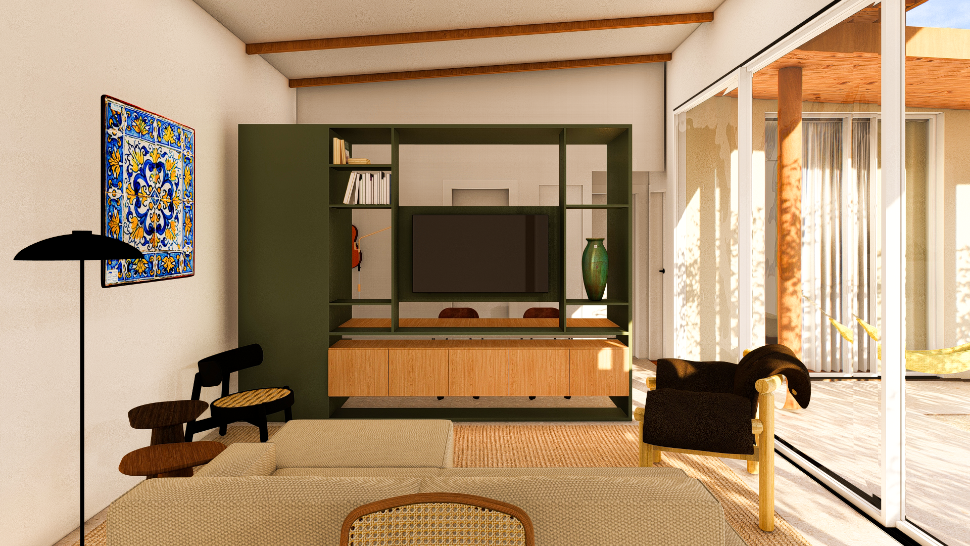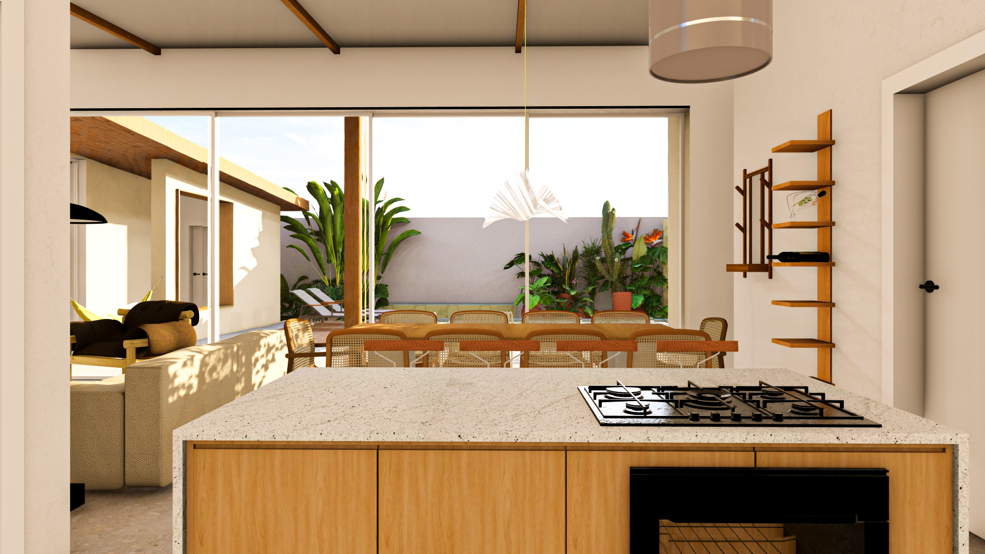 É na varanda que a vida acontece: ela se configura como um corredor externo de circulação, mas também como espaço de permanência — seja na rede ou no banco que enquadra a paisagem. Ela promove a integração entre interior e exterior, ampliando as possibilidades de uso. Além de um espaço de churrasqueira, controlado por uma porta, que quando aberta marca momentos de encontro, conversas e celebrações, e um novo espaço externo se cria.