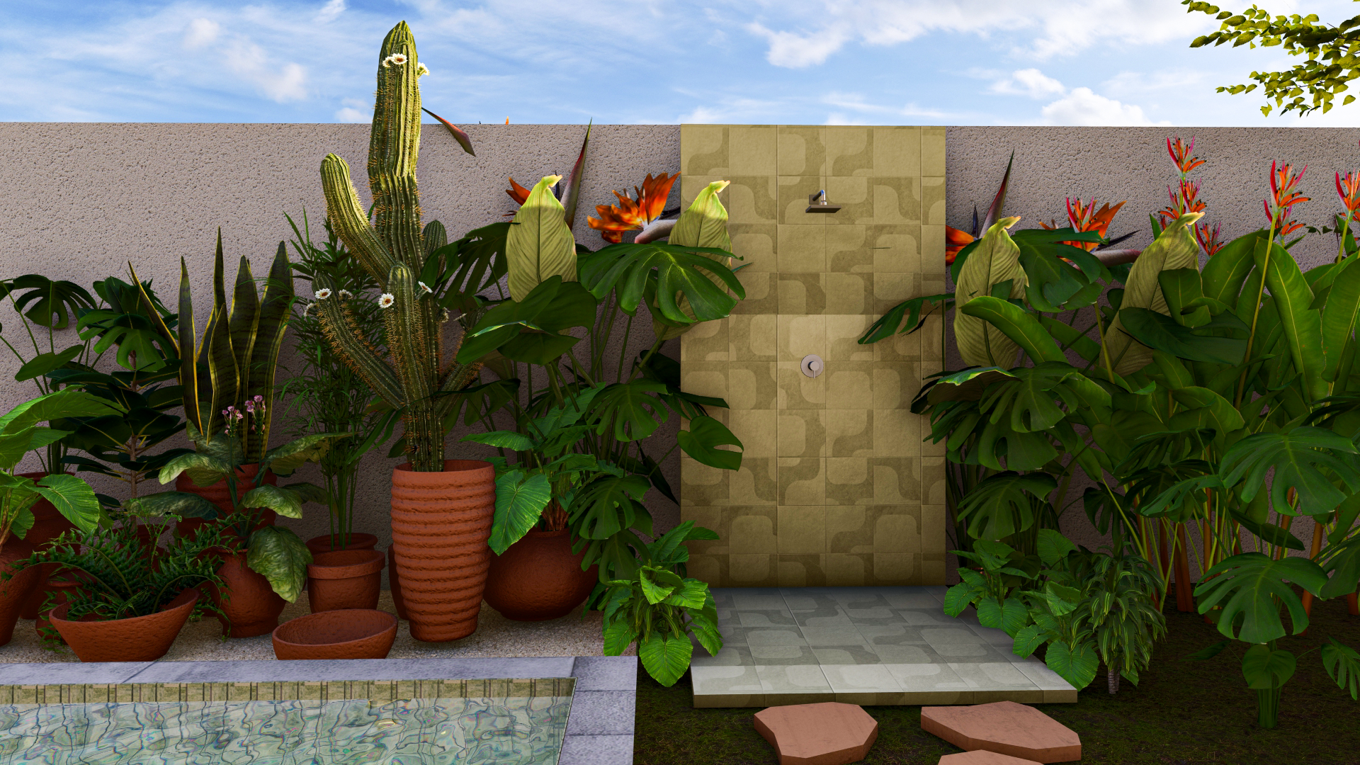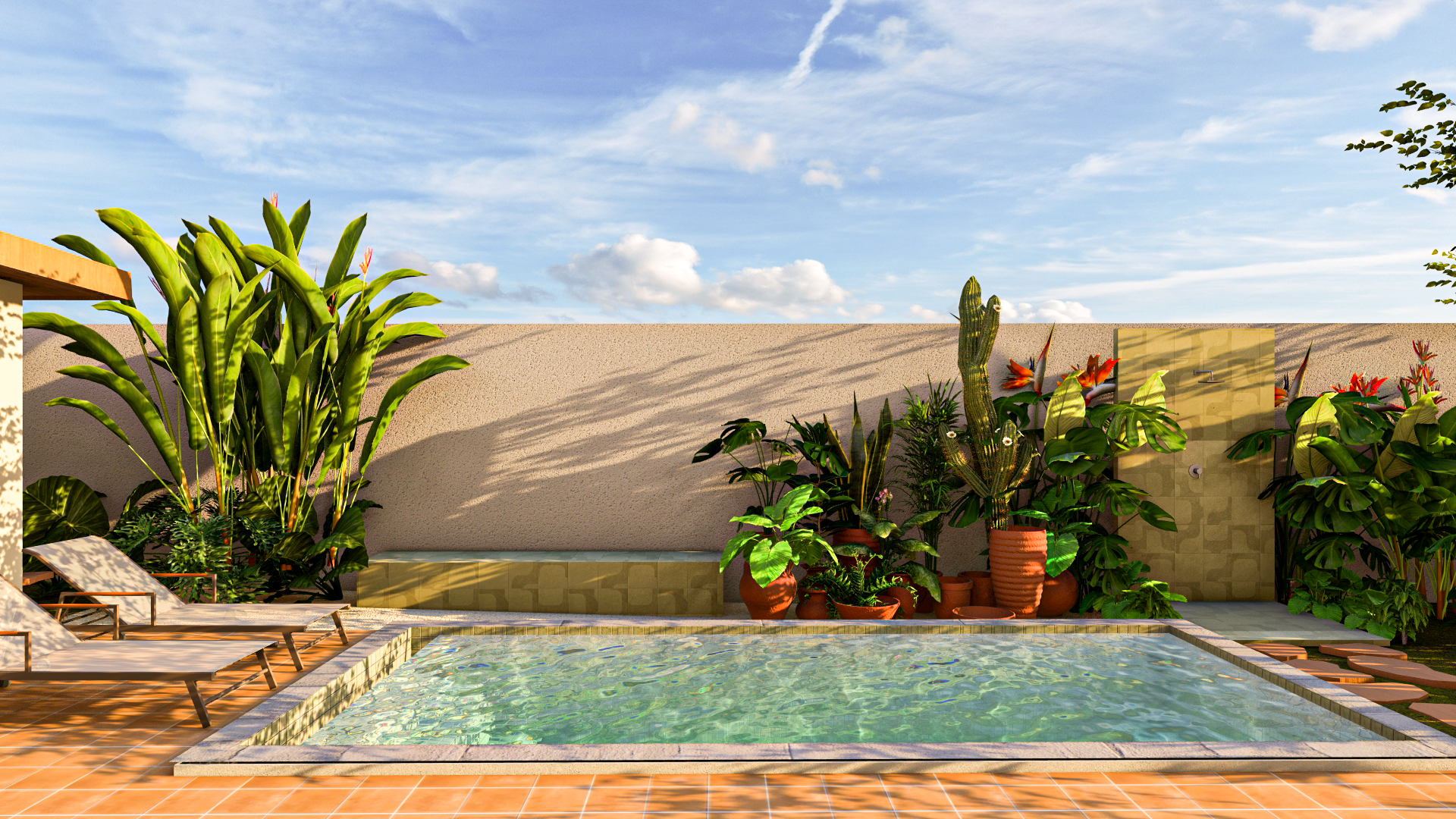 São espaços plurais, pensados para diferentes experiências, assim como outros itens mais simples: o chuveirão integrado ao paisagismo, bancos ao sol, desenhos de piso que conduzem o percurso e sugerem descobertas.