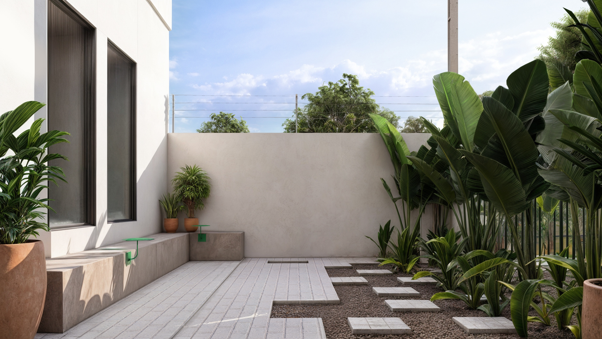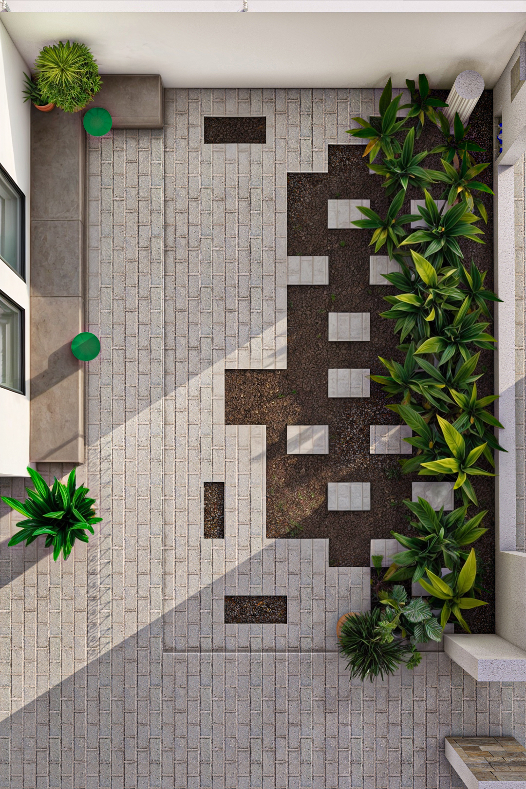 Um banco foi projetado para compor com o jardim, para criar um espaço de reunião externa, com algumas mesas de apoio. Relembrando as antigas conversas de rua, onde se reuniam na calçada.