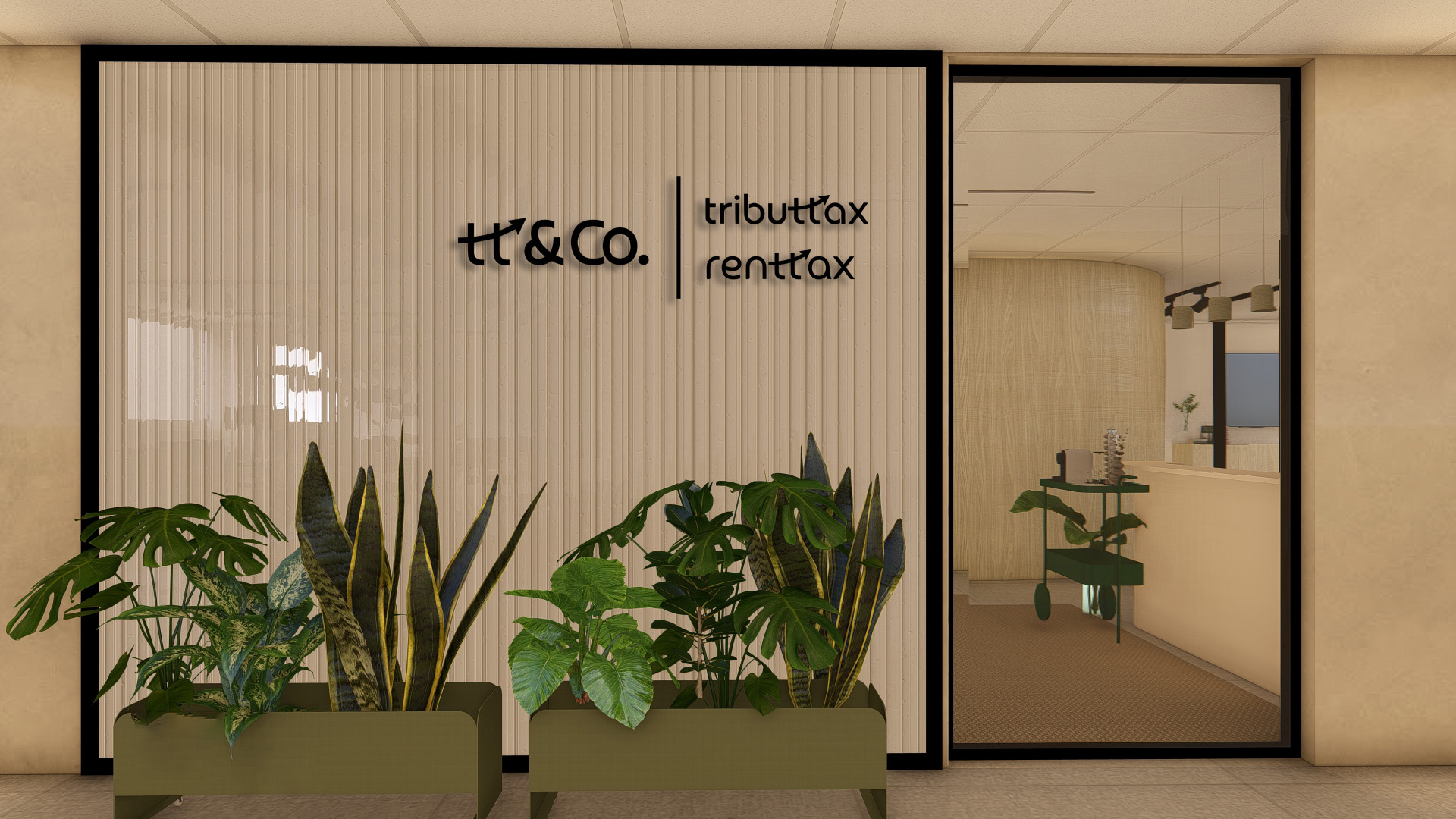 Logo na entrada, uma recepção com sofás e poltronas para receber os clientes, e assim que se sai do elevador, uma grande vedação em policarbonato com o logo da marca, já convidando para entrar.