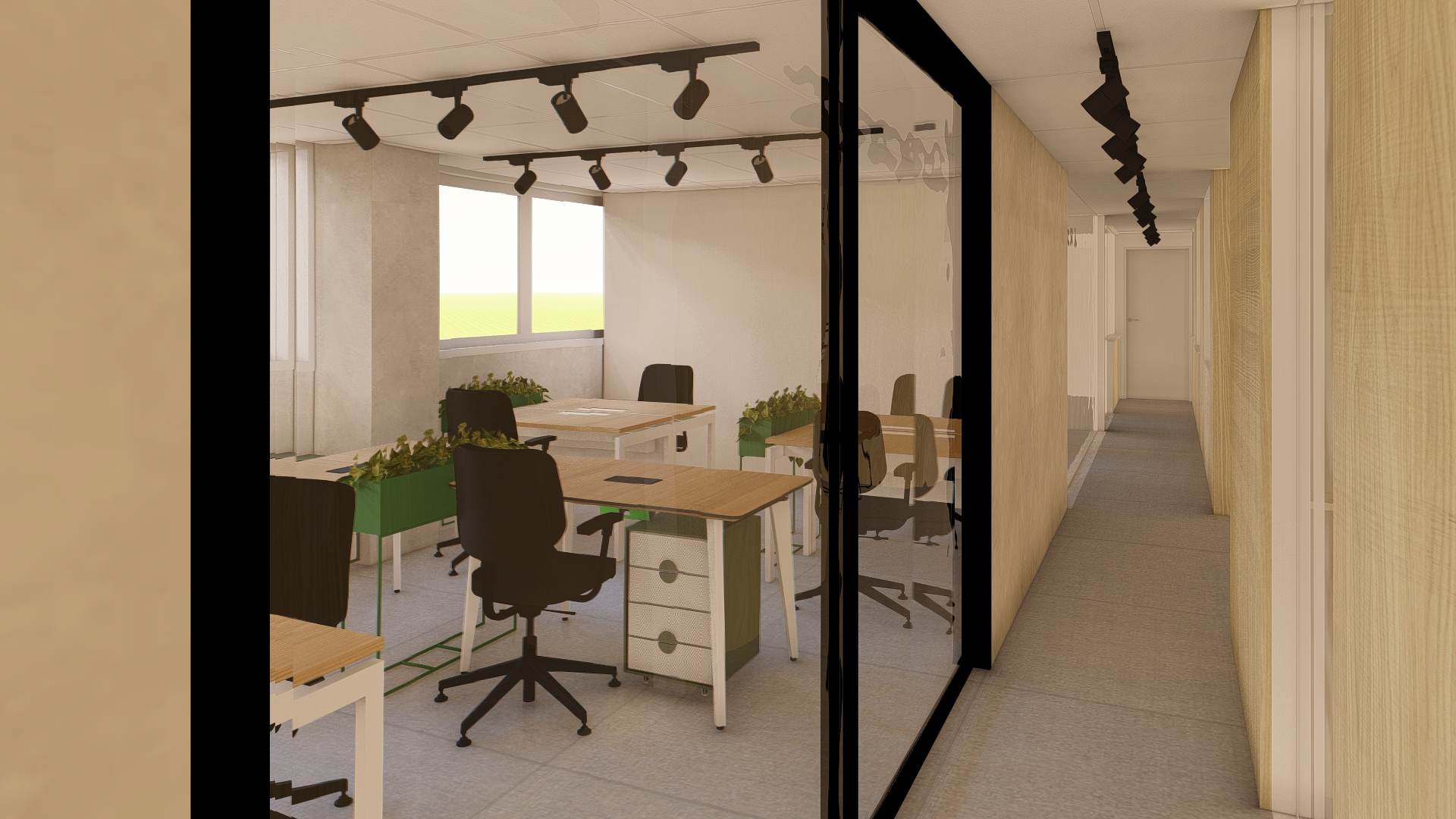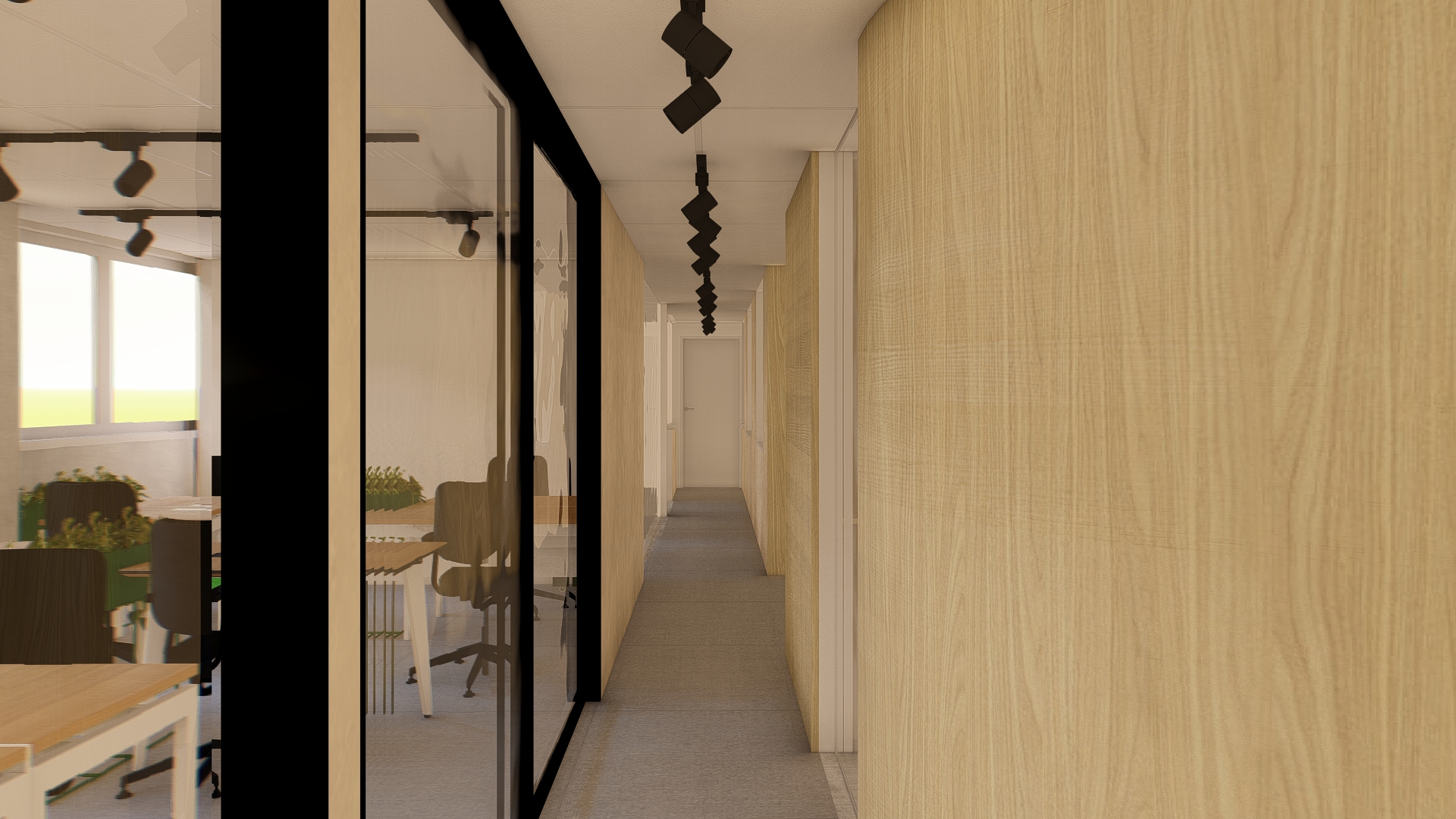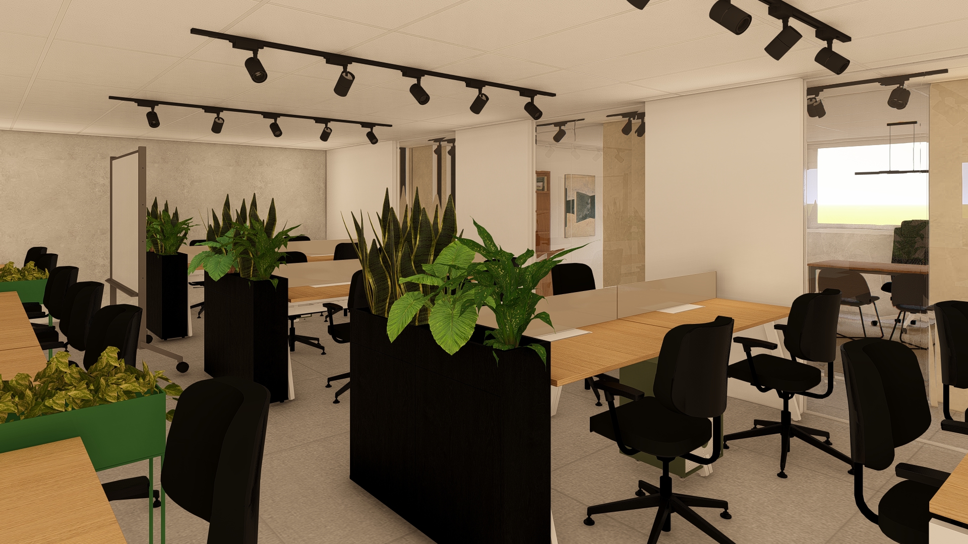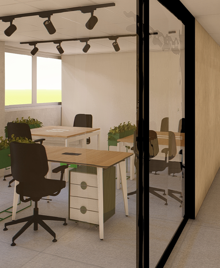 Nas laterais foram mantidas: salas de reuniões, sócios e advogados, e aos centros, criamos espaços para equipe de marketing e comercial.