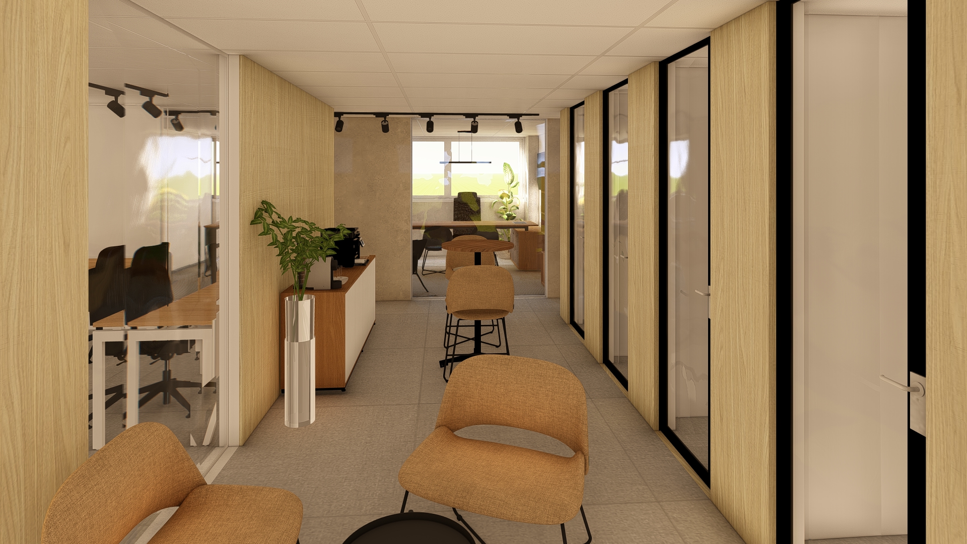 Como a mudança e a obra deveriam ser rápidos, pisos, forros e esses volumes prévios foram mantidos, apenas adaptando para os novos usos, reformulando os espaços ao fundo, prolongando os das laterais e criando uma ilha ao centro, onde se encontram cabines para reuniões online, mesas e poltronas para os funcionários.